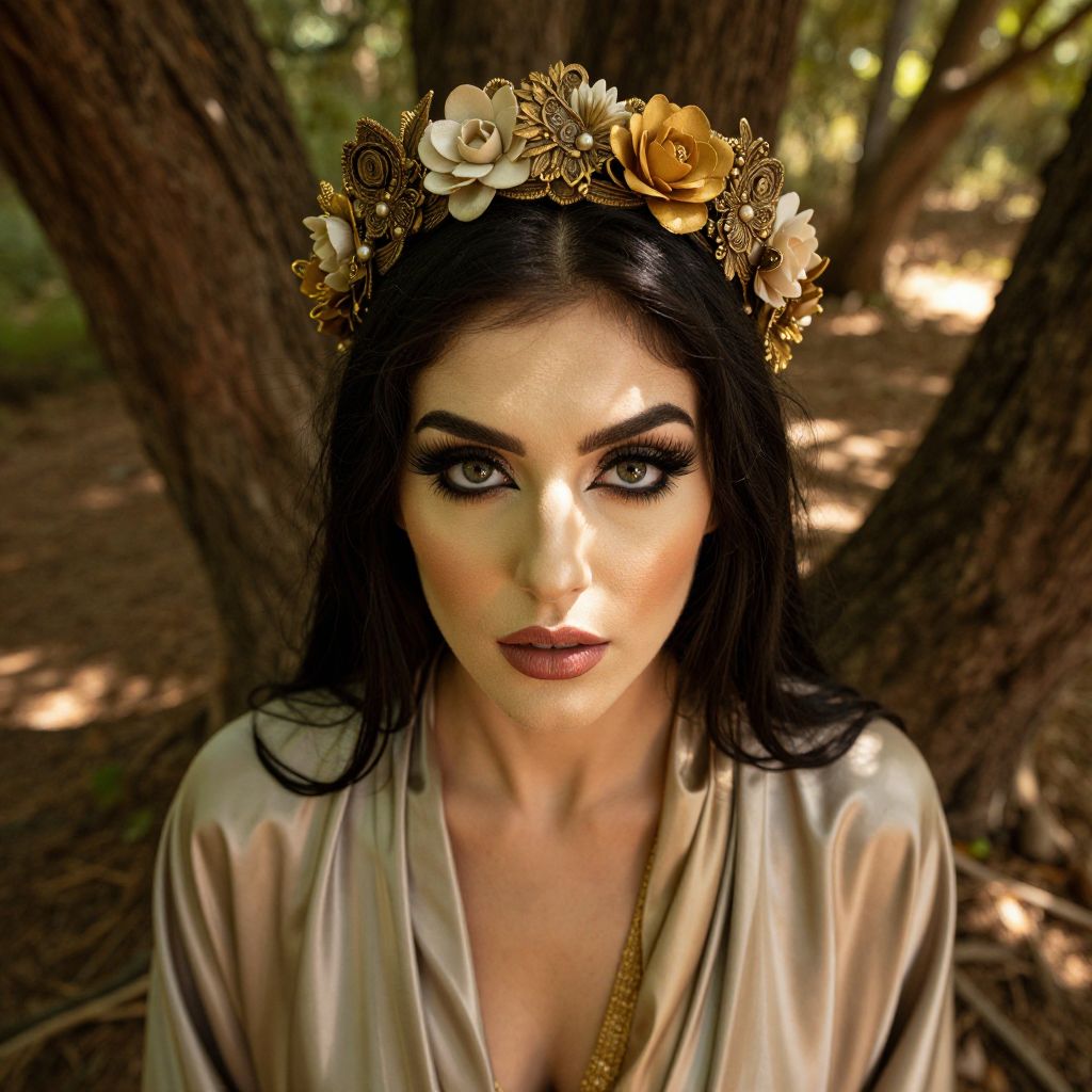A captivating portrait photograph showcases a North African woman's allure with porcelain skin and raven hair, her intense gaze accentuated by thick lashes and arched brows. Warm, golden light filters through a lush forest, casting dappled shadows across her face. From an unconventional bird's-eye perspective, the intricate details of her floral crown and cascading silk robes are highlighted, exuding ethereal grace amidst ancient trees.