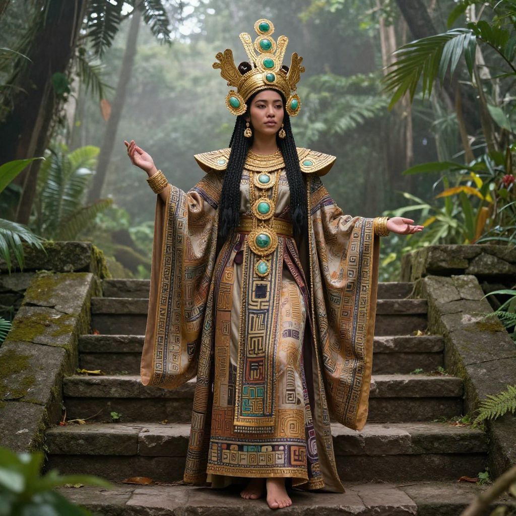 Mayan princess costume, elaborate golden crown with jade stones, flowing fabric with ancient geometric patterns, ceremonial pose beside stone steps, misty morning jungle environment