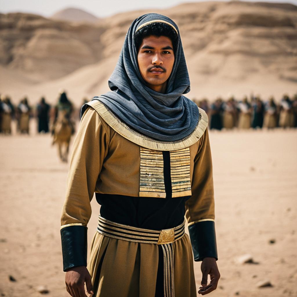Egyptian soldier costume ,1boy, male focus, solo, standing, blurry, looking at viewer, closed mouth, outdoors, blurry background, cowboy shot