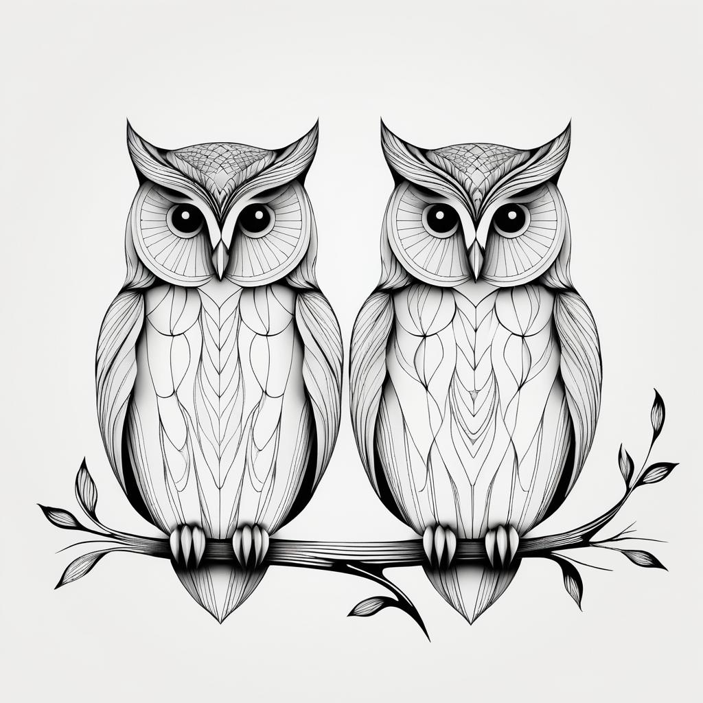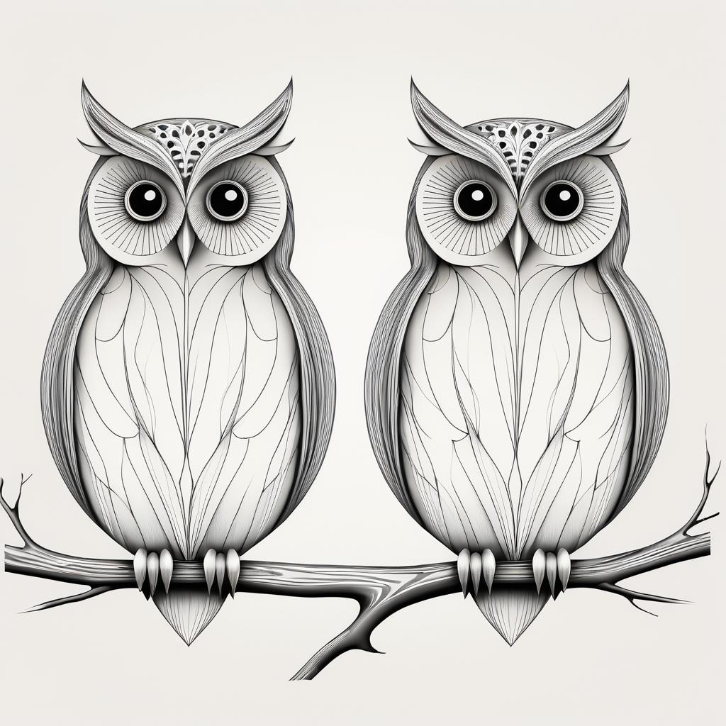 Elegant and simple black-and-white pencil drawing depicting a pair of male and female owls perched on a branch. The illustration features intricate line work with minimalist design emphasizing the owls' detailed feathers and large expressive eyes. The artwork captures the contrast and symmetry between the two birds in a refined and artistic style.