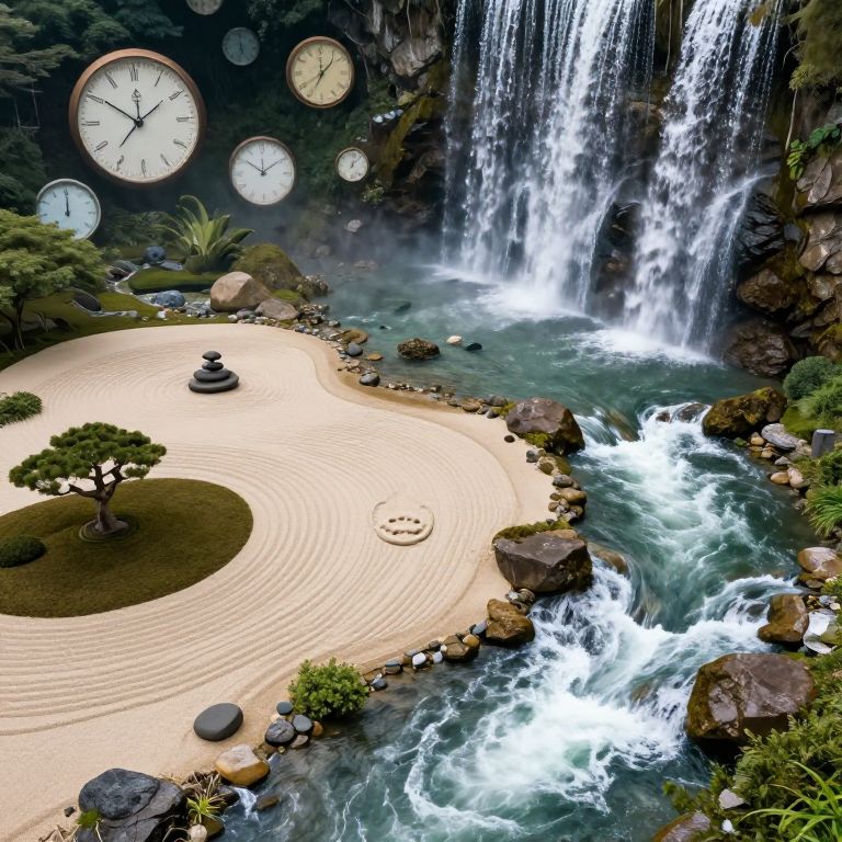 Visualize an aerial perspective that seamlessly blends the serene tranquility of a Zen-inspired garden with the untamed energy of cascading waterfalls. The meticulously designed sand formations evoke a sense of harmony and balance, only to be disrupted by the unexpected transformation into turbulent rivers, seemingly defying natural laws. In the background, floating timepieces in various sizes and states – some whole, others distorted as if caught between dimensions – contribute an enigmatic backdrop that bridges the gap between order and chaos. This captivating scene transitions from a meditative calm to exhilarating wonder, encapsulating nature's dynamic forces within a surrealistic tableau.