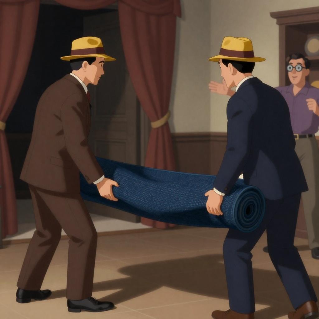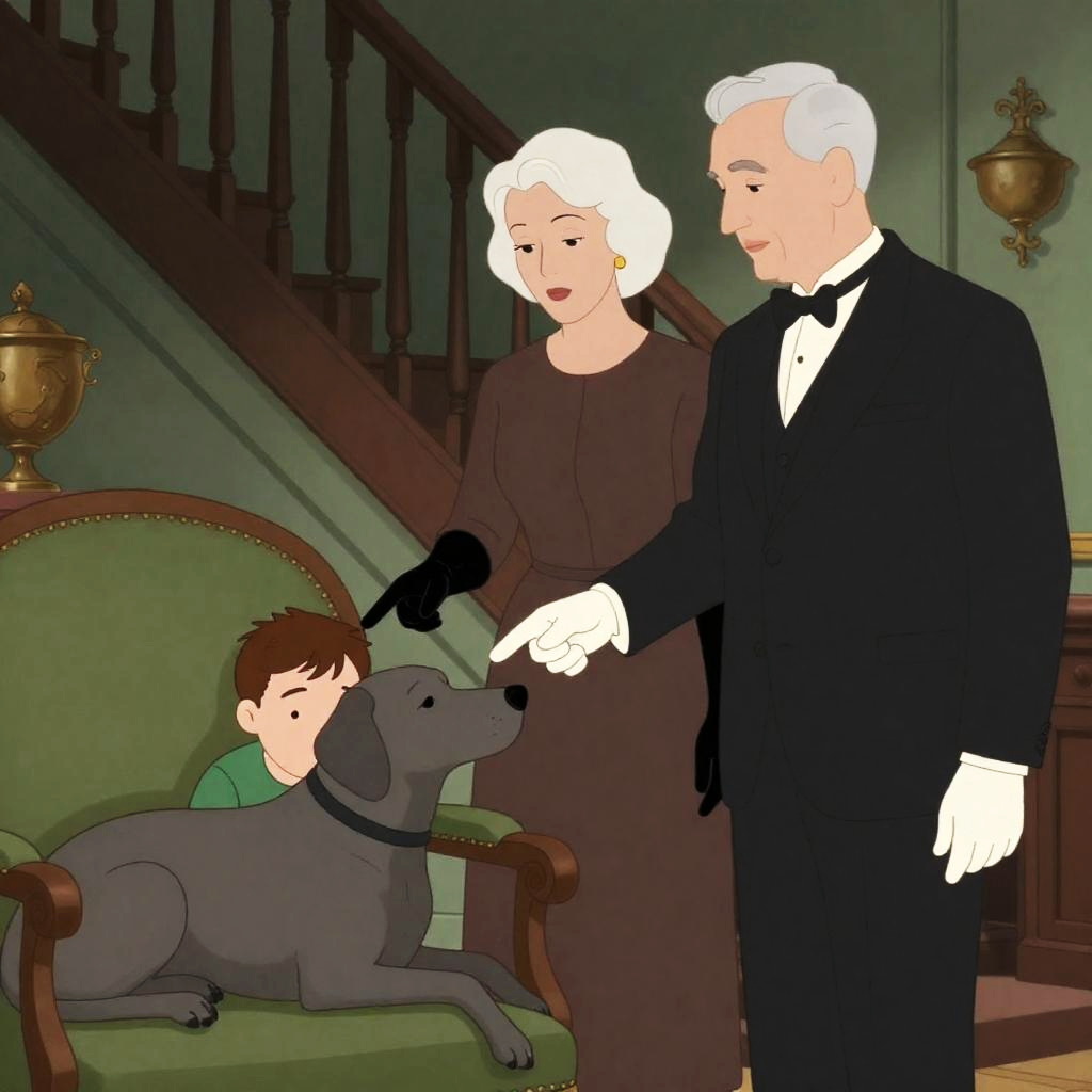 Illustration of a scene with a man in a white shirt and yellow glove, holding a wicker basket, standing in a doorway. Surrounding him are six people in formal attire, looking at him. The room has ornate green and gold decor. "EXIT" sign above the door. Man has a mustache. One woman in red dress is seated, others standing. Background includes red curtain and detailed wall decor.