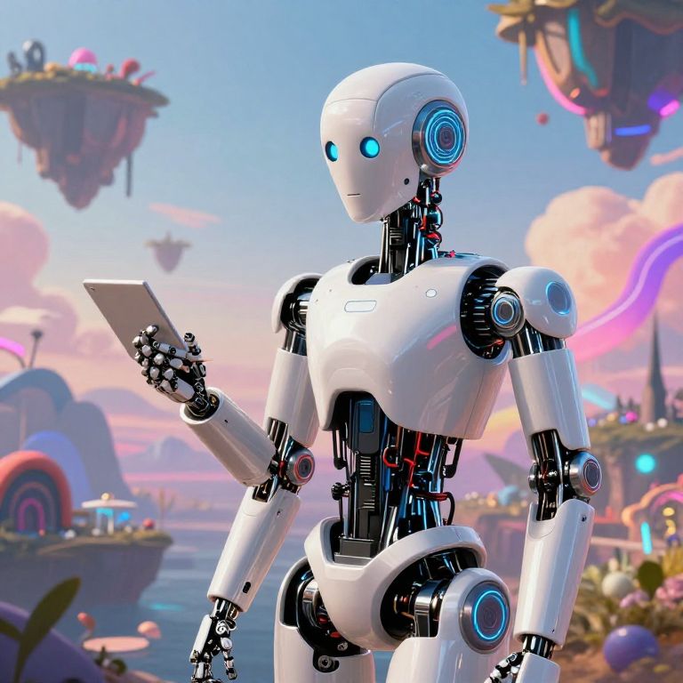 Change background AI concept showing an advanced robot artist reimagining photo backgrounds with surreal dreamlike elements including floating islands, neon skies, and abstract shapes, blending reality and fantasy, detailed digital painting with soft lighting.