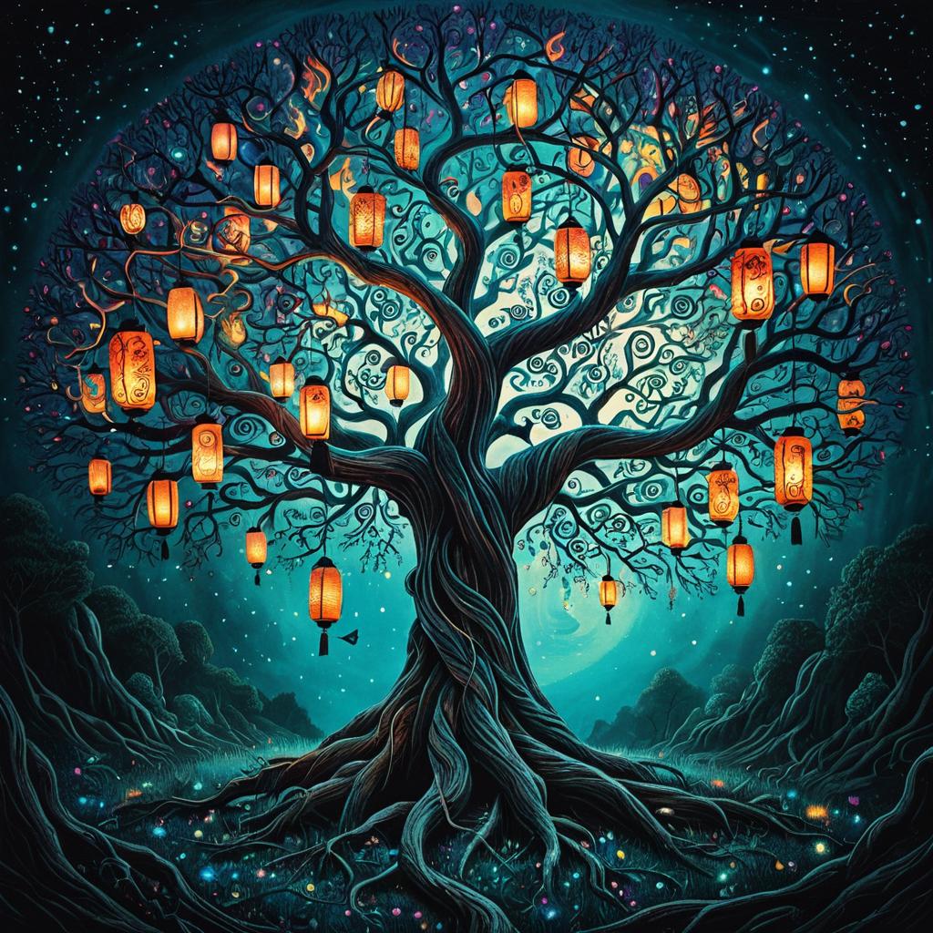 Ancient lantern, growing long roots and flowers, rustic ink sketch, rough parchment, ink blots, white background