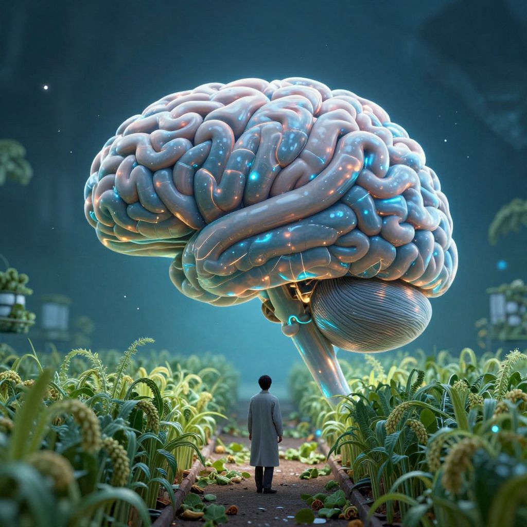 Cells within a giant human brain farm memories like crops, harvesting thoughts under the holographic light of forgotten realities.
