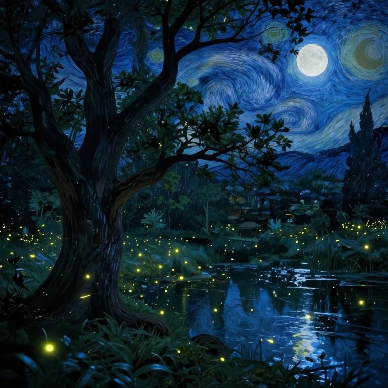 Imagine an enchanting nocturnal scene illuminated by a soft blue moonlight, reminiscent of Van Gogh's celestial brushstrokes. In the foreground, a grand, age-old tree casts its protective shadow over a serene pond where tiny, luminescent fireflies frolic on the water's surface. The composition is captured from above, as if seen through the eyes of a soaring bird, highlighting the whimsical charm and captivating atmosphere of this mystical realm. This dreamlike panorama, characterized by ethereal light and gentle motion, beckons the viewer to pause and be captivated by its tranquil majesty while evoking wonder at nature's concealed marvels.