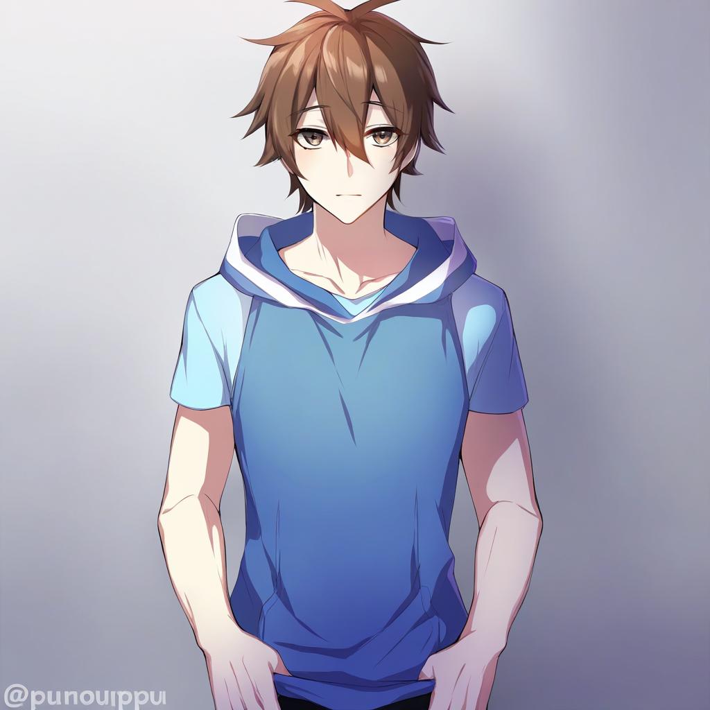 Illustration of a young anime male character with short brown hair and brown eyes. He is wearing a light blue t-shirt with a blue sleeveless hoodie over it, the hoodie hood is down. The character has a neutral expression and light skin tone. The style is inspired by the Kagerou Project, created by artist Puuzaki Puuna.