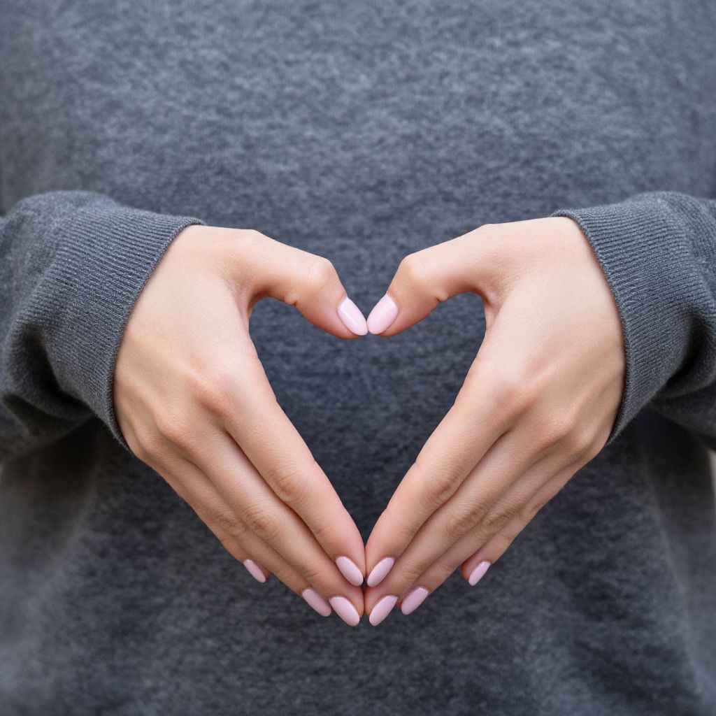 Woman's hands gracefully forming a delicate heart shape, framed by cozy gray sleeves and complemented by soft pink nail polish.