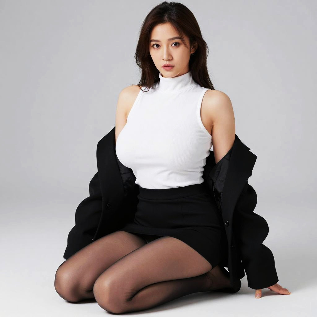 Photograph of a stylish Asian woman in a black blazer, white blouse, black mini skirt, and sheer stockings, standing in a modern office at