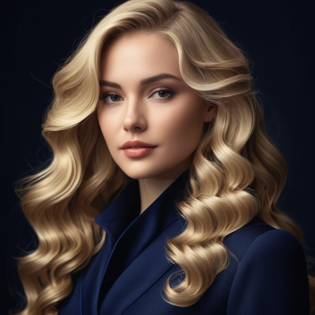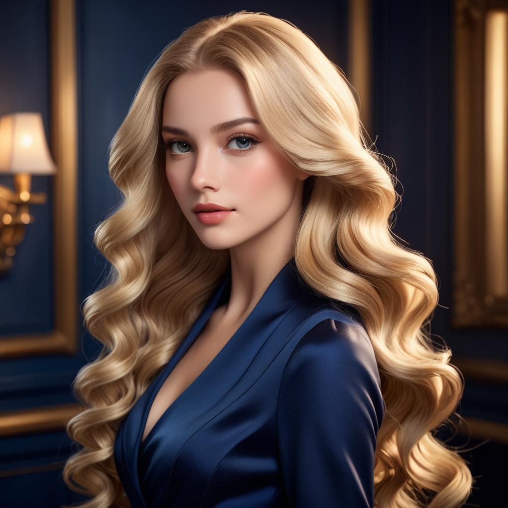 A stunning young woman with long, flowing blonde hair styled in elegant waves, wearing a deep blue outfit, posed indoors with warm, soft lighting highlighting her flawless skin and delicate features, classic beauty and glamour atmosphere, detailed and realistic portrait style
