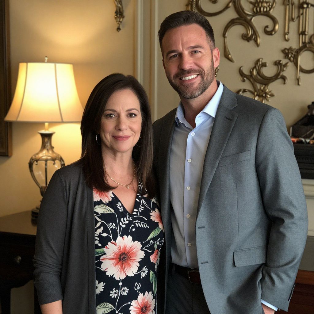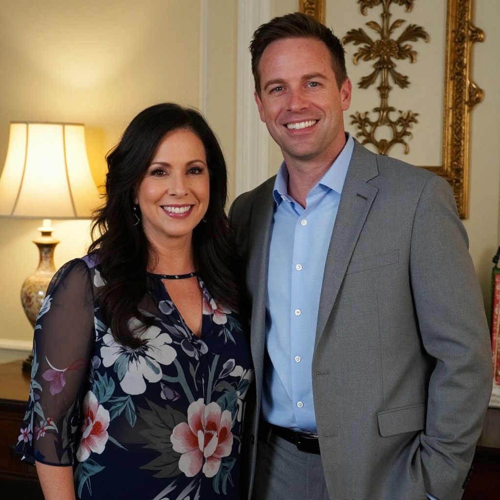 Jesse Spencer, dressed in a gray suit jacket over a blue shirt, stands smiling beside a woman wearing a floral-patterned top, both positioned in a warmly lit room featuring a vintage-style lamp and ornate wall decor.