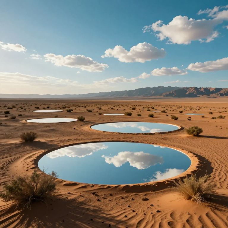 Mirrors embedded in a vast desert landscape reflect the azure sky and scattered clouds, creating an illusion of floating surfaces amidst sparse shrubs and distant mountains under a serene, sunlit horizon.