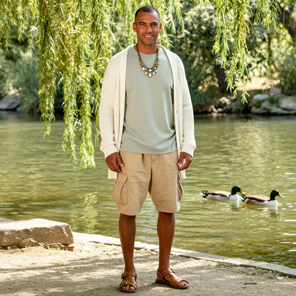 A man, textured cotton t-shirt in muted sage, relaxed-fit cargo shorts in sand, woven leather sandals, oversized cardigan in cream, statement necklace with natural stones, sun-drenched riverbank, willow trees swaying, ducks gliding on water, Cibachrome style, relaxed smile.Man has masculine face and piercing eyes