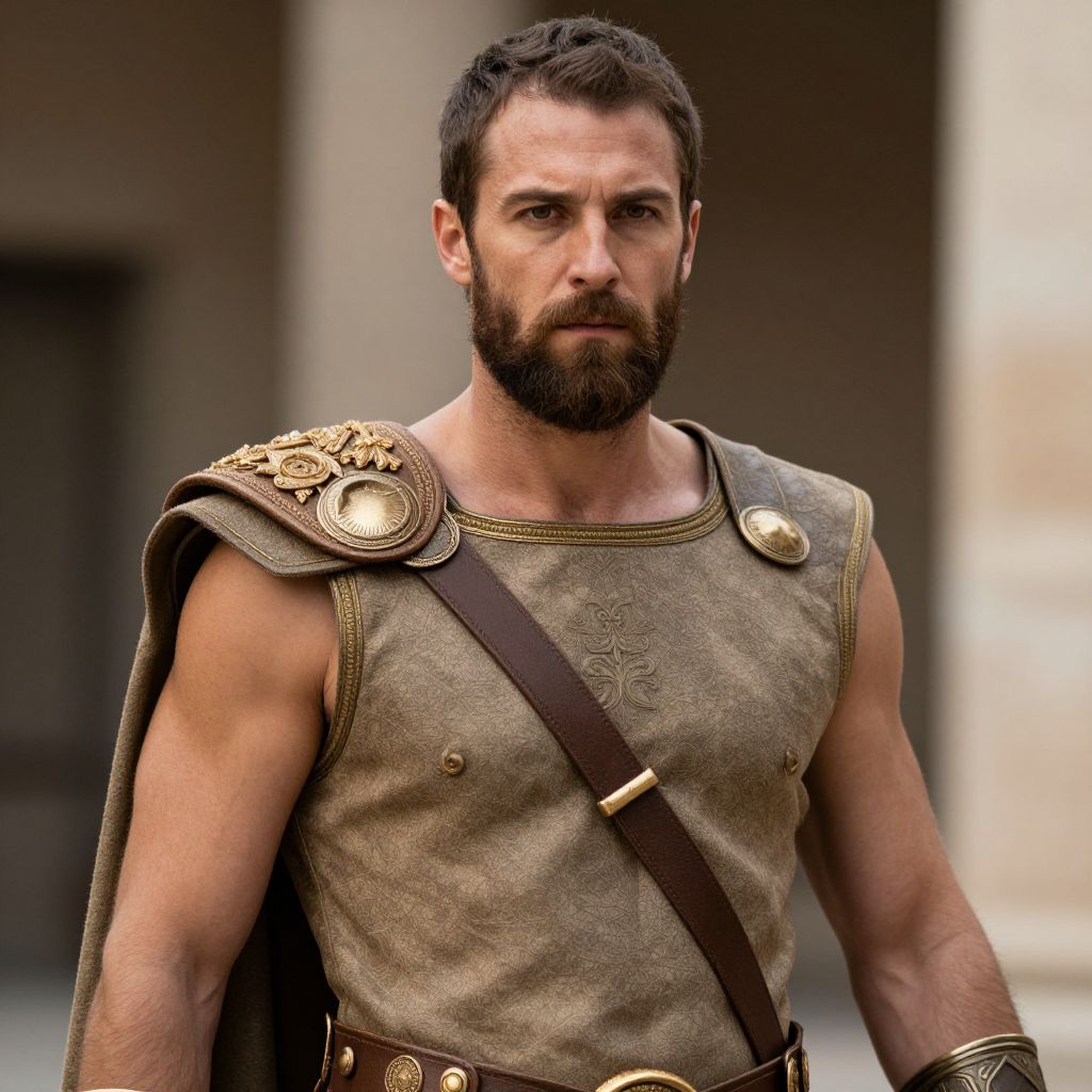 Greek god atlas costume, a close up of a man with a beard and a cape