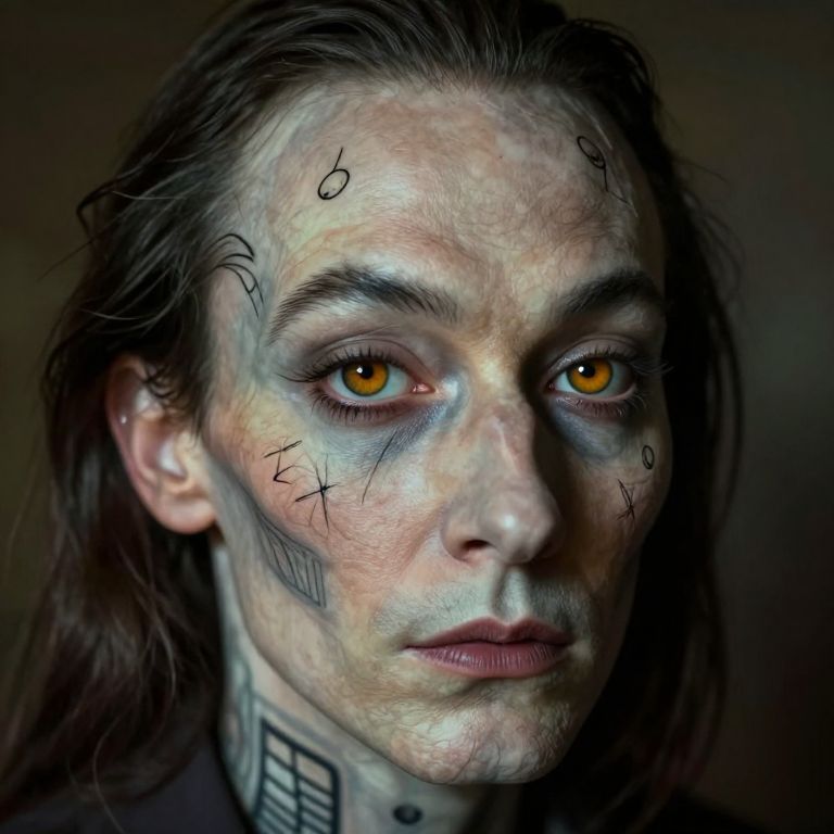 Photorealistic digital portrait of a pale, tattooed man with long dark hair, intense orange eyes, and black scribbles on his face,