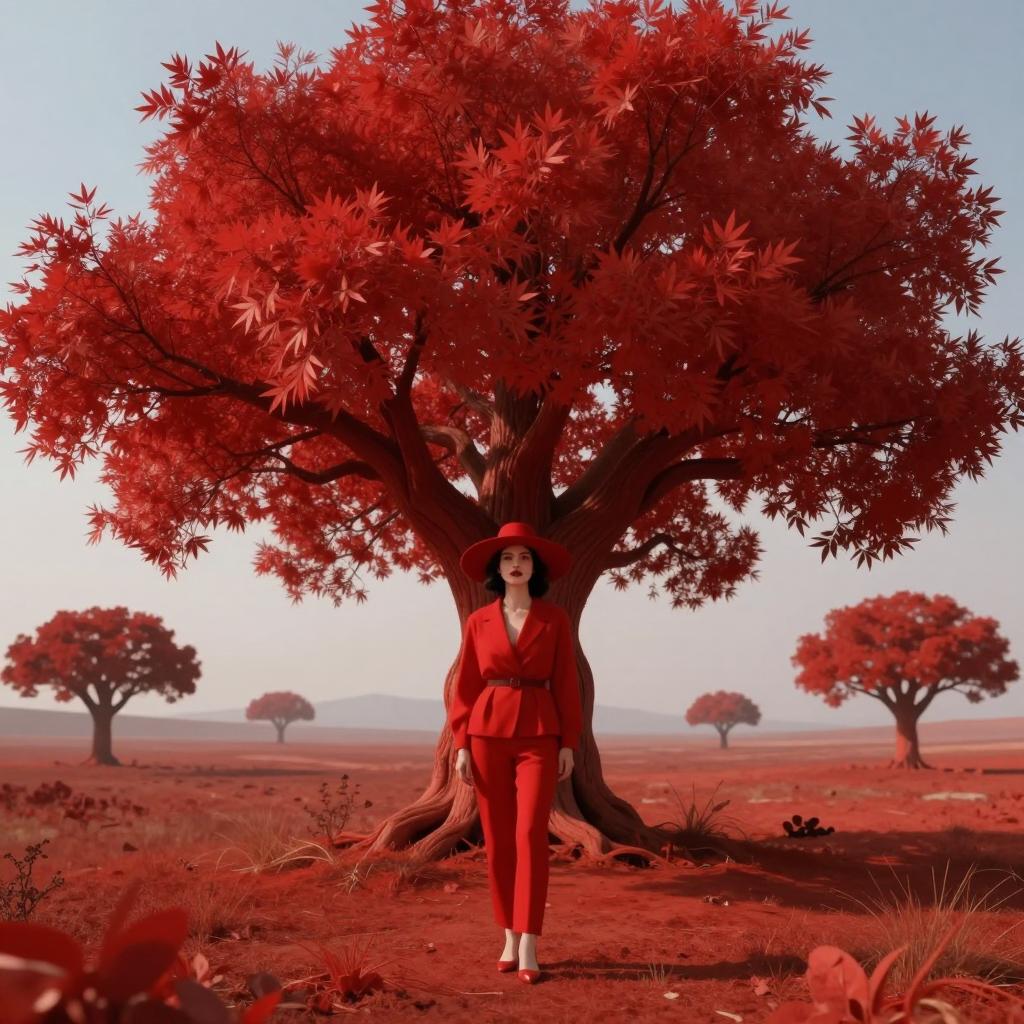 This striking digital artwork features a woman adorned in a bold red outfit and hat, standing against a surreal landscape dominated by a magnificent, red tree reminiscent of the distinctive style of Casey Weldon. The vibrant colors and imaginative scene create a dreamlike atmosphere, inviting viewers to explore the depths of creativity and nature's intertwining beauty.