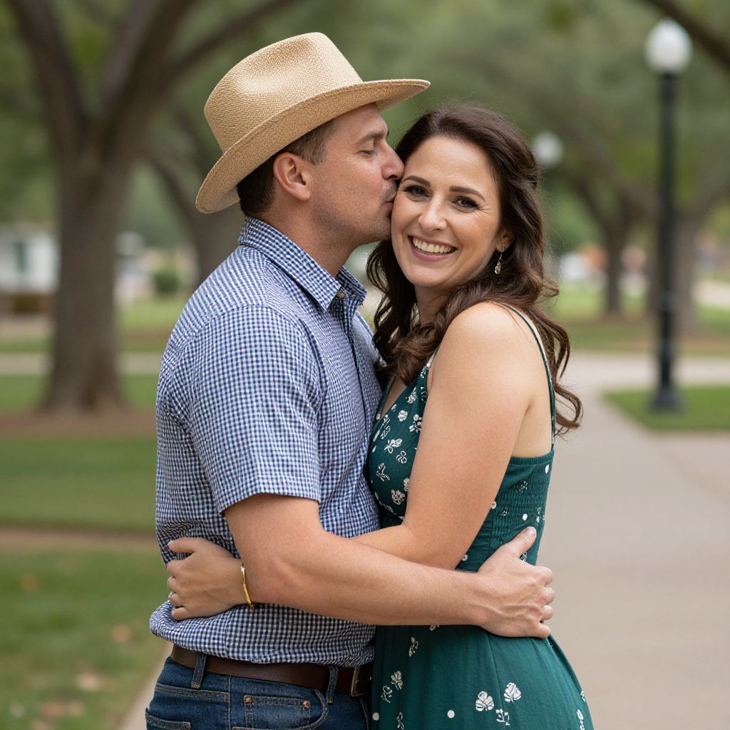 Photograph of a smiling couple in a park; she wears a white cowboy hat and denim dress, he in a navy polo, kissing her cheek,