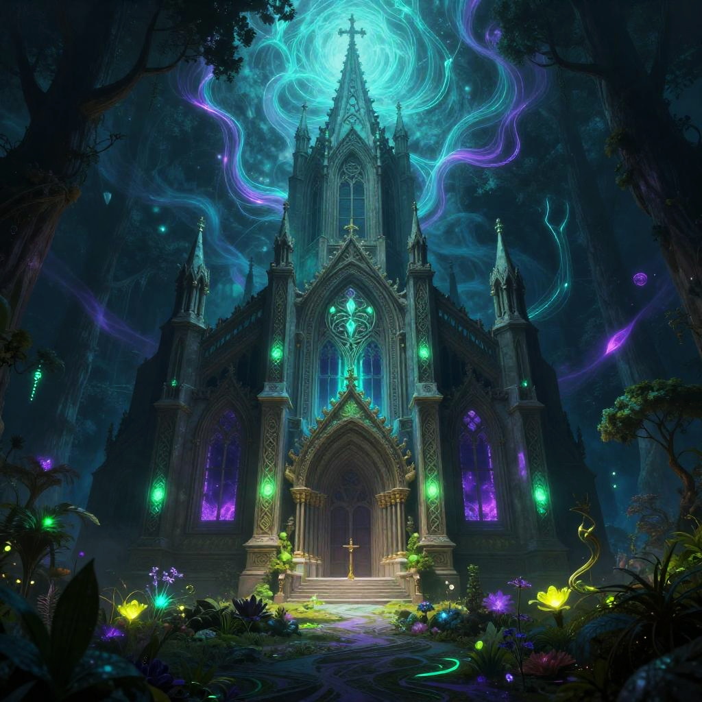 Bioluminescent Elven Cathedral in Mystical Garden