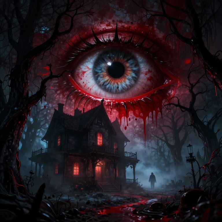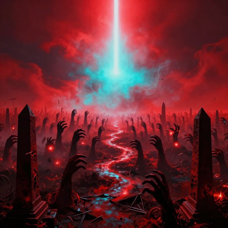 An enormous spiral staircase made of translucent glass ascends into a stormy, blood-red sky filled with fragmented memories that scream and writhe, At the center, a figure with no discernible face dissolves into a swarm of black insects that reform and disintegrate with each step, The stairs crack and reform beneath their feet, each ripple sending shockwaves through the memories, The surreal scene now embodies a descent into madness, with chaotic visuals and unnerving, glowing accents, aidmafluxproultra