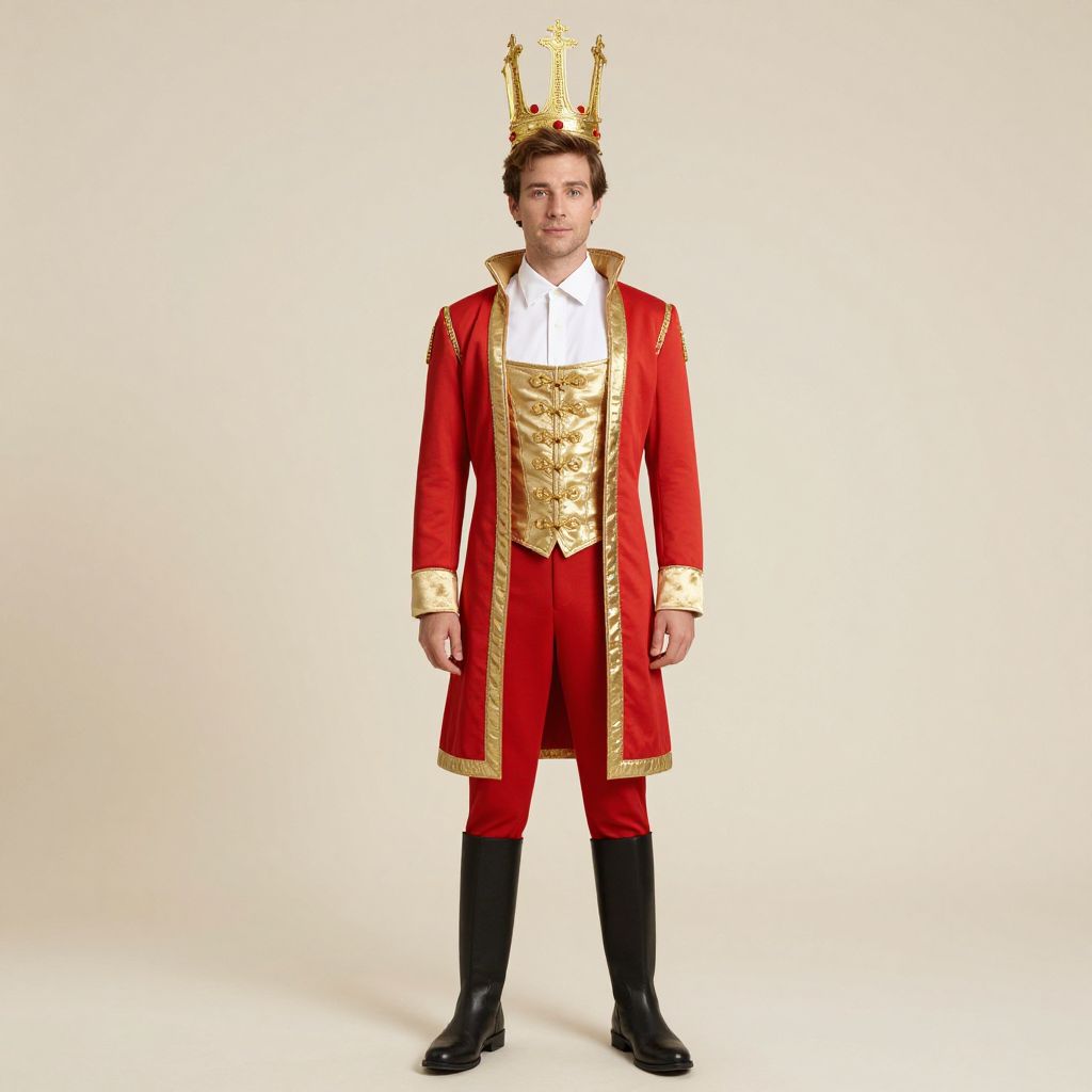 Photograph of a man standing, wearing a red and gold royal costume with a gold crown, white shirt, black pants, and black shoes, against