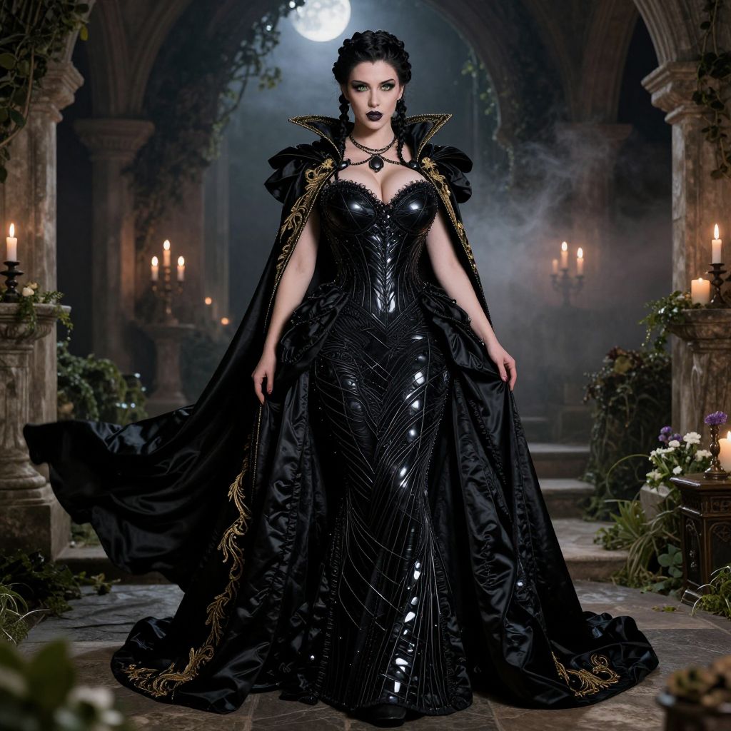 A bold and fierce woman with braided dark hair and intense green eyes stands in a dark, candlelit mansion garden, dressed in a lavish black ballgown with a futuristic cut and metallic thread accents. The gown flows like liquid obsidian around her, and she wears a matching cloak with golden embroidery. The setting is dramatic and mysterious, with fog and moonlight enhancing the eerie elegance of the costume. Cinematic realism, natural lighting, rich shadows.. The woman has big tits and cute face