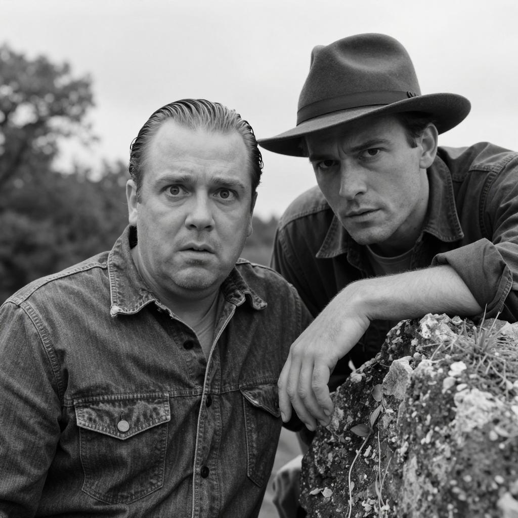 Black and white photograph of three men in a bunk bed. Man on left with beard, smiling, wearing jacket. Middle man with slicked-back hair, serious expression, checkered shirt, and jacket. Man on right, heavier, looking at middle man, wearing jacket. Bunk bed with metal frame in background. Middle man holding cup in right hand. Intense expressions.