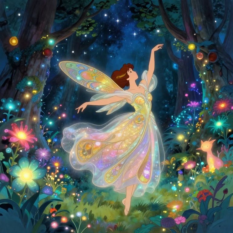 A mesmerizing blend of delicate artistry reminiscent of Alphonse Mucha's intricate designs and the whimsical landscapes of Hayao Miyazaki brings to life a captivating scene where a celestial dancer gracefully moves within a vibrant, bioluminescent forest. The ethereal beauty, adorned with gossamer wings and an opulent gown emitting shimmering hues, pirouettes under the starlit canopy as her fluid movements harmonize with the pulsating glow of luminescent flora and fauna. From a dreamlike 'bug's-eye view' perspective, this evocative image invites viewers to immerse themselves in the tender dance between nature and magic, experiencing an emotional spectrum that balances serenity and enchantment.