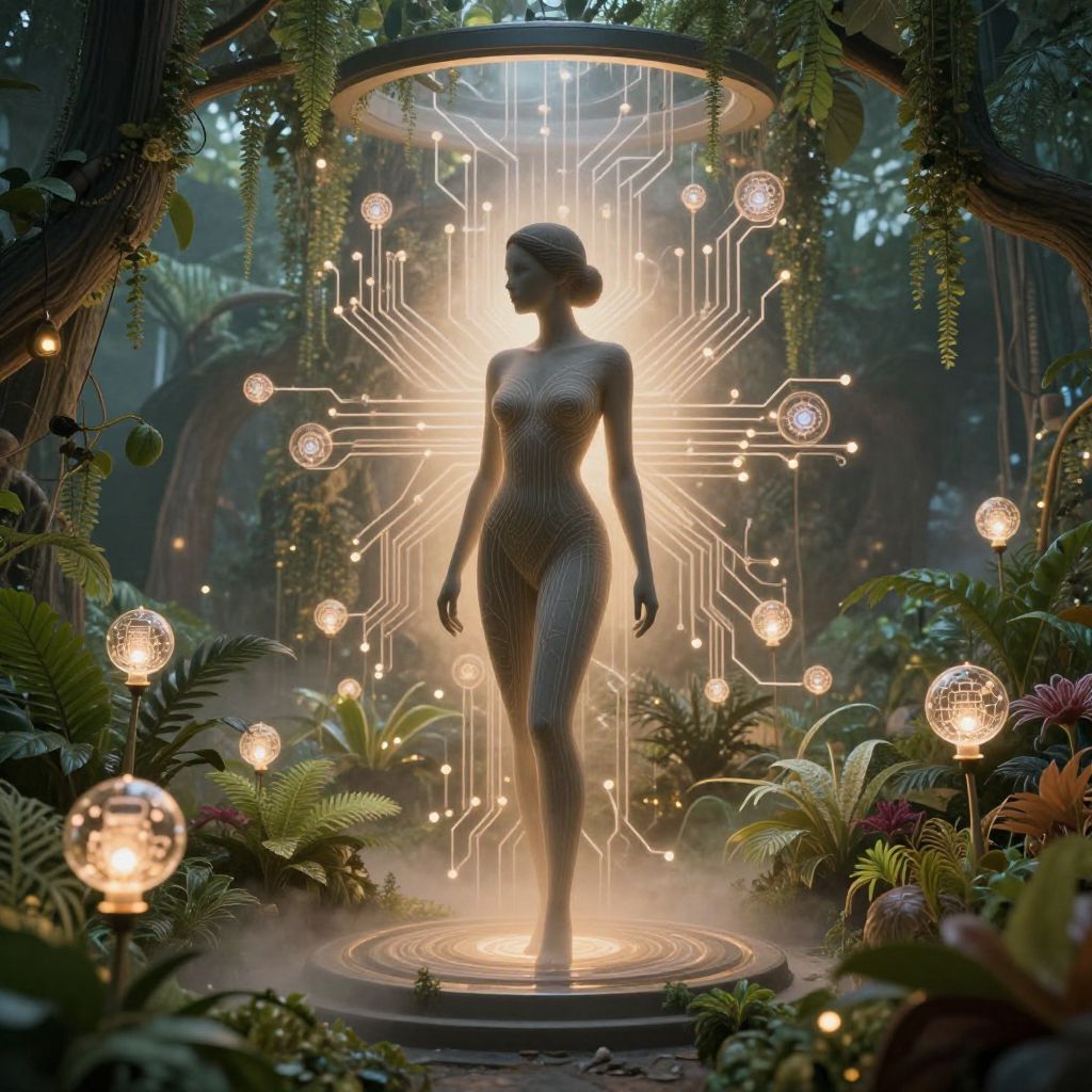 Voluptuous AI inside a floating garden of organic circuits, surrounded by glowing plants with integrated AI nodes, natural and synthetic harmony, lush environment with mist and ambient warmth, elegant silhouette, seamless blend of biology and technology, Flux style aesthetic.