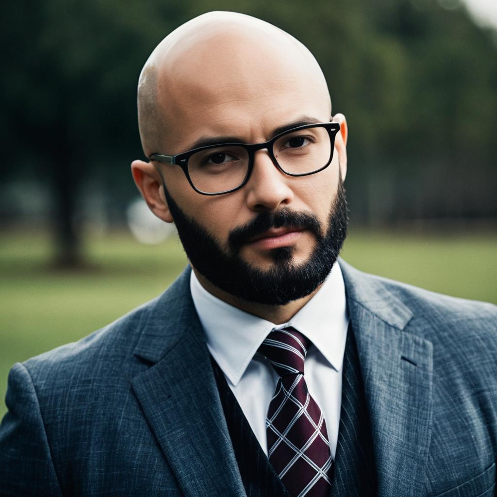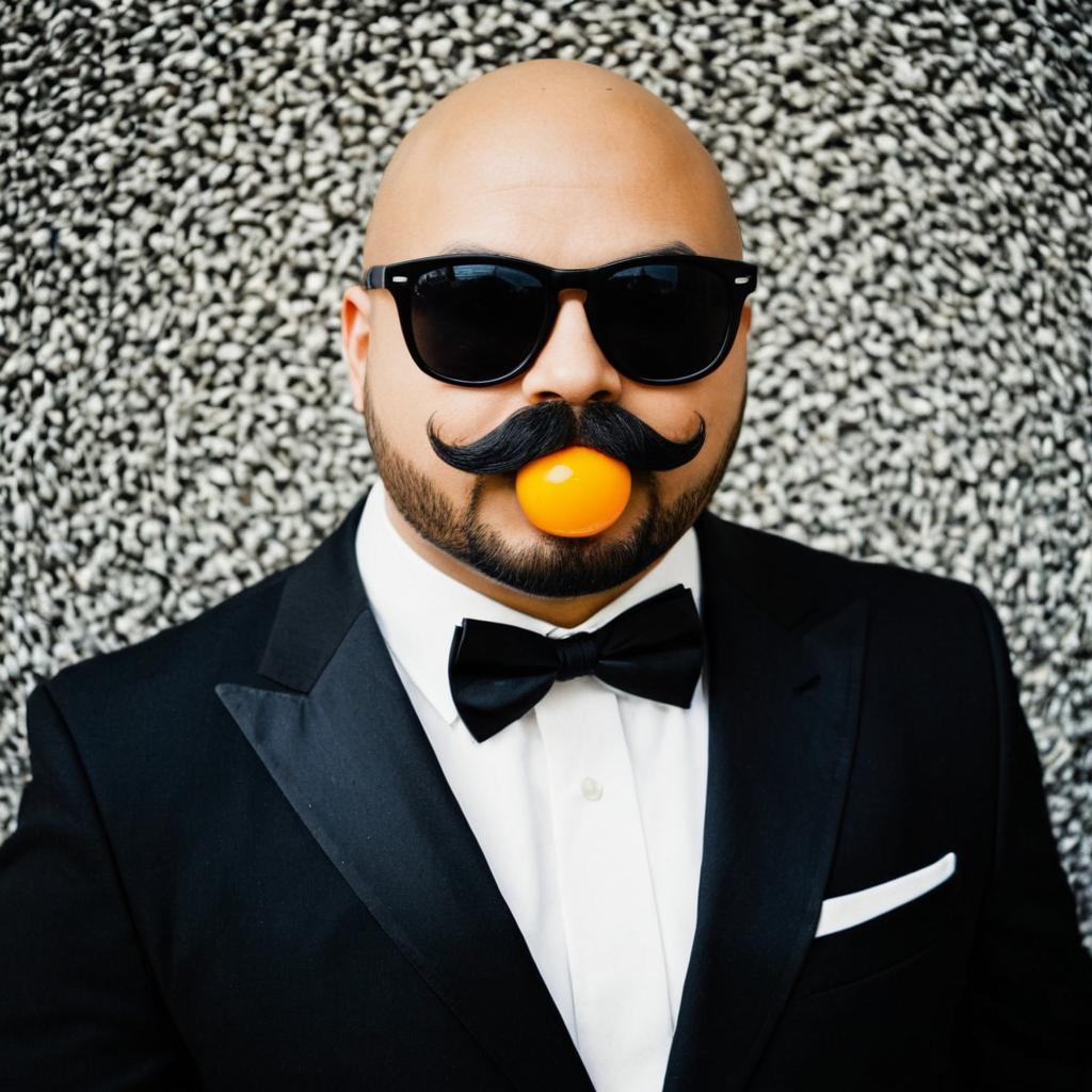 Bald man wearing a black formal suit, white dress shirt, and black bow tie. He has a styled curled mustache and beard, black sunglasses, and is humorously holding a bright orange egg yolk in his mustache. The background features a textured black and white pattern.