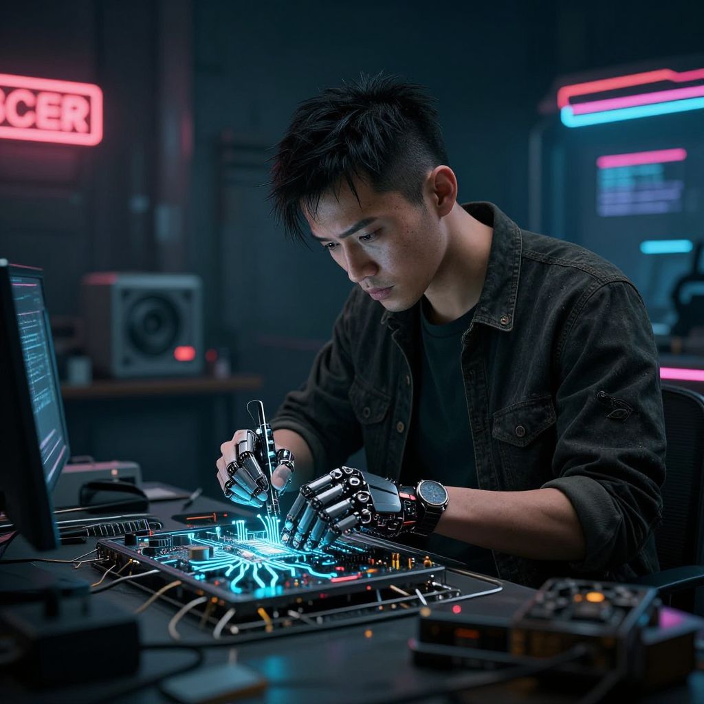 Character making AI: a cyberpunk engineer assembling an AI android in a dark city laboratory surrounded by neon signs and futuristic gadgets, gritty textures combined with glowing circuitry, cinematic atmosphere emphasizing the fusion of human and machine