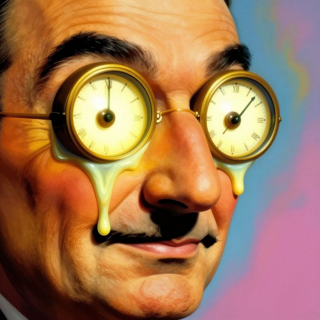 Surreal art featuring Bob Hope nose, oversized and highlighted with melting clock elements, inspired by Dali, dreamlike colors and fluid shapes, vintage Hollywood twist