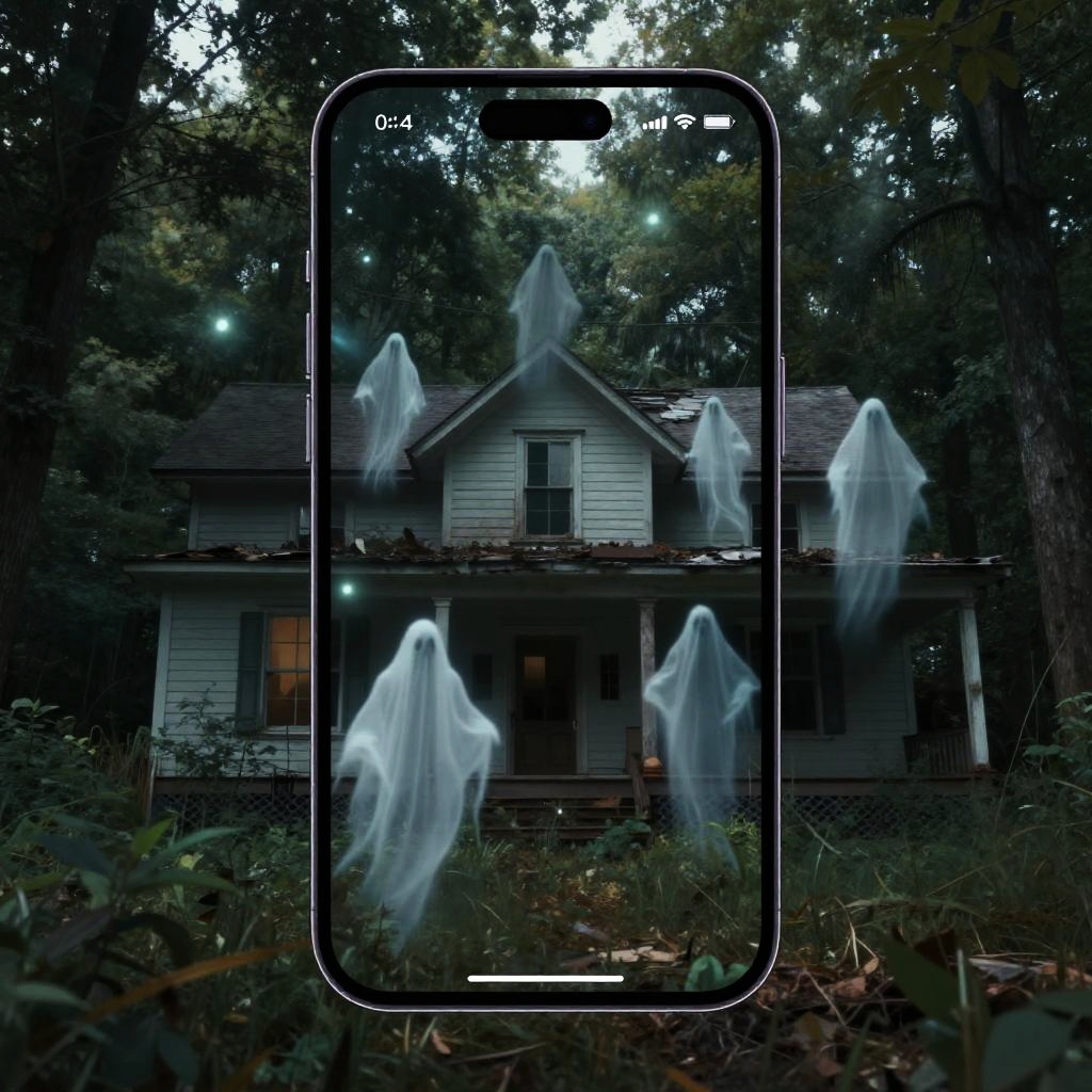 Ghost photo app in use at night, person holding phone capturing translucent ghosts in an old cemetery, mist swirling under moonlight, eerie shadows, glowing spirits faint in the background, detailed phone UI with spooky ghost detection features, supernatural vibe.