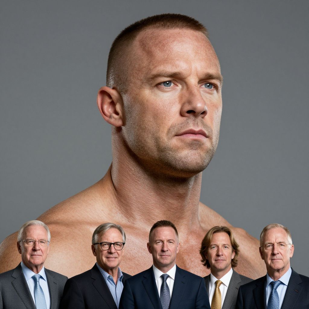 Photograph of a large, muscular, shirtless man with short brown hair and blue eyes in the background, slightly blurred. In the foreground, there are five men standing in a row, all dressed in formal business attire: black suits, white shirts, and ties. The men have varying hairstyles and facial hair, with one wearing glasses. The background is a plain, gray gradient, and the lighting highlights the men's faces and the muscular man's upper body. The image has a digitally enhanced, slightly surreal quality.