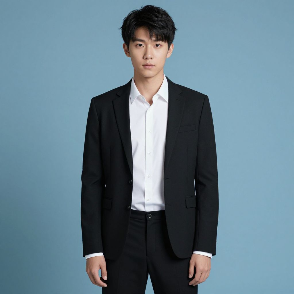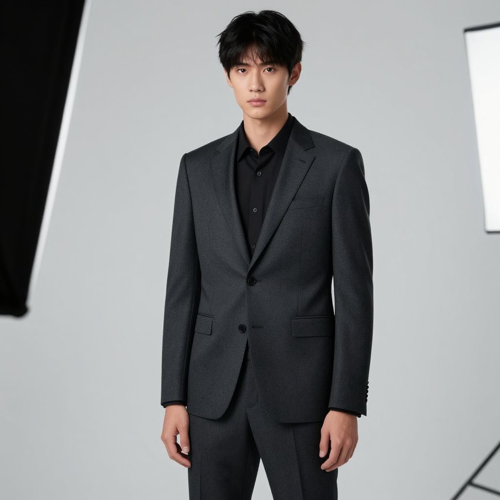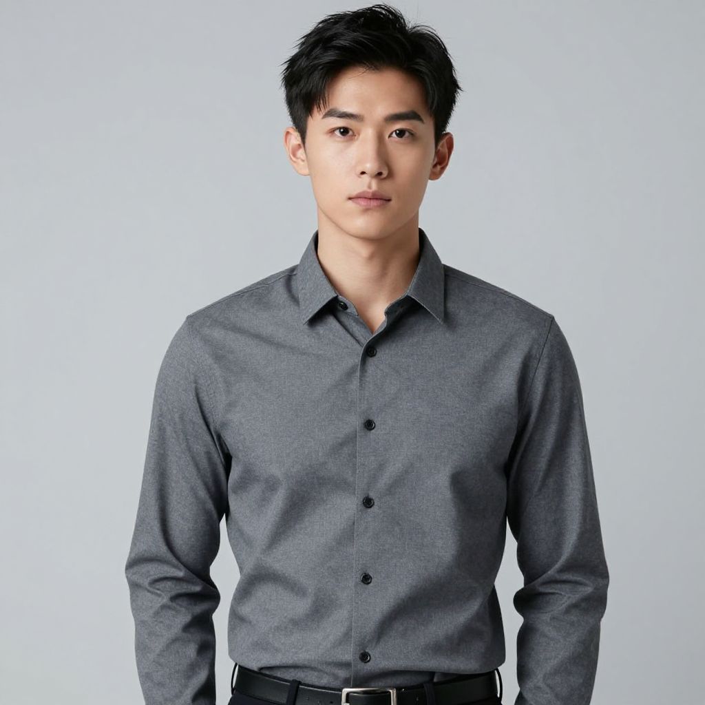 "male burgundy pants costume, solo, 1boy, male focus, belt, shirt, jacket, hand in pocket, pants, grey background, looking at viewer, standing, realistic, red pants, closed mouth, suit, black hair, formal, long sleeves, simple background, collared shirt, gradient background Realistic photo of casual sexy person with pretty face"