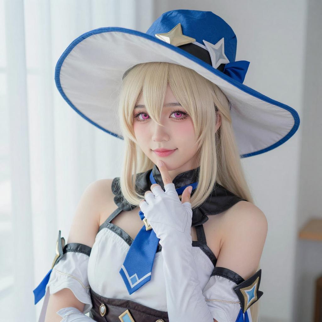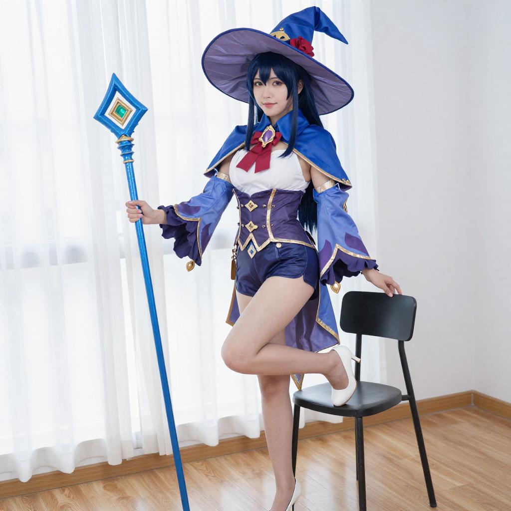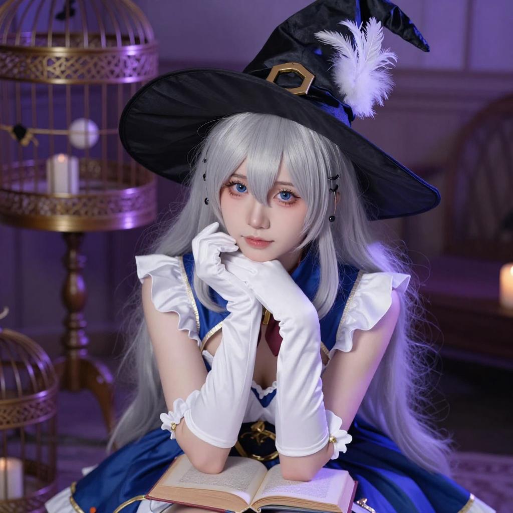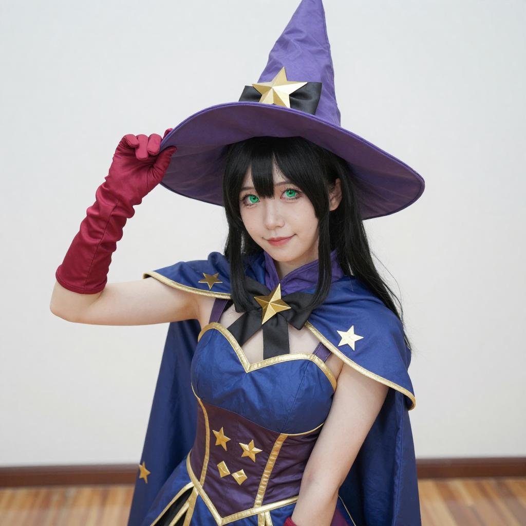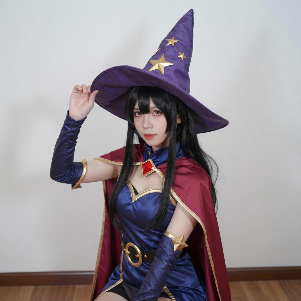 Photograph of a woman in a detailed blue and red cosplay outfit, resembling a magical character with a large purple hat, star-patterned gloves, and a red cape. She holds a pink book and poses with one hand near her face. Background includes a lamp and bookshelf in a brightly lit room.