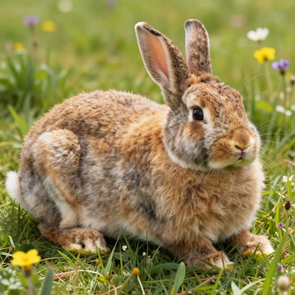 Photograph of a fluffy brown and gray rabbit with large ears, sitting on lush green grass. The rabbit's fur has a mix of light and dark brown, with white patches on its underbelly and legs. Its eyes are dark and alert, and its nose is small and pink. The background is slightly blurred, showing scattered yellow and white wildflowers. Bright sunlight highlights the rabbit's fur, creating a warm, natural atmosphere. The image has a high-contrast, vibrant style, emphasizing the rabbit's soft texture and the greenery around it.