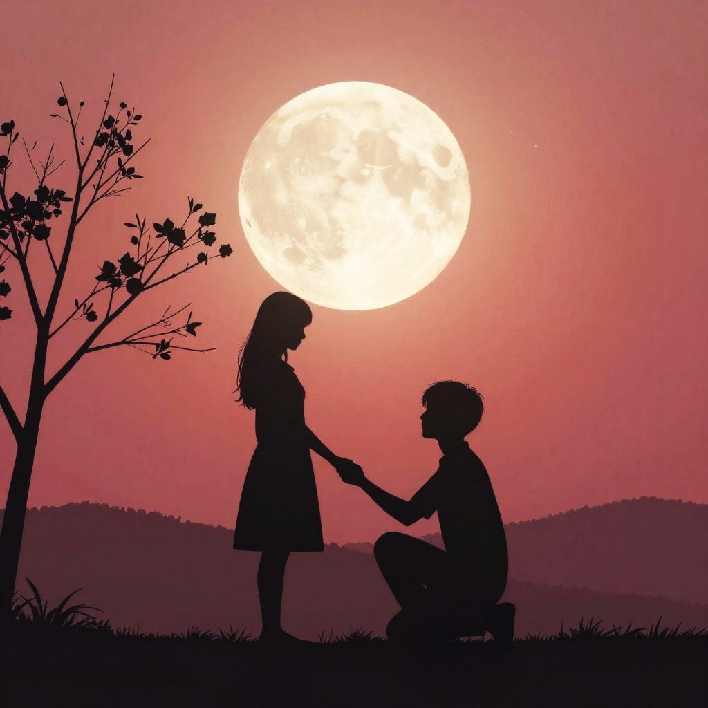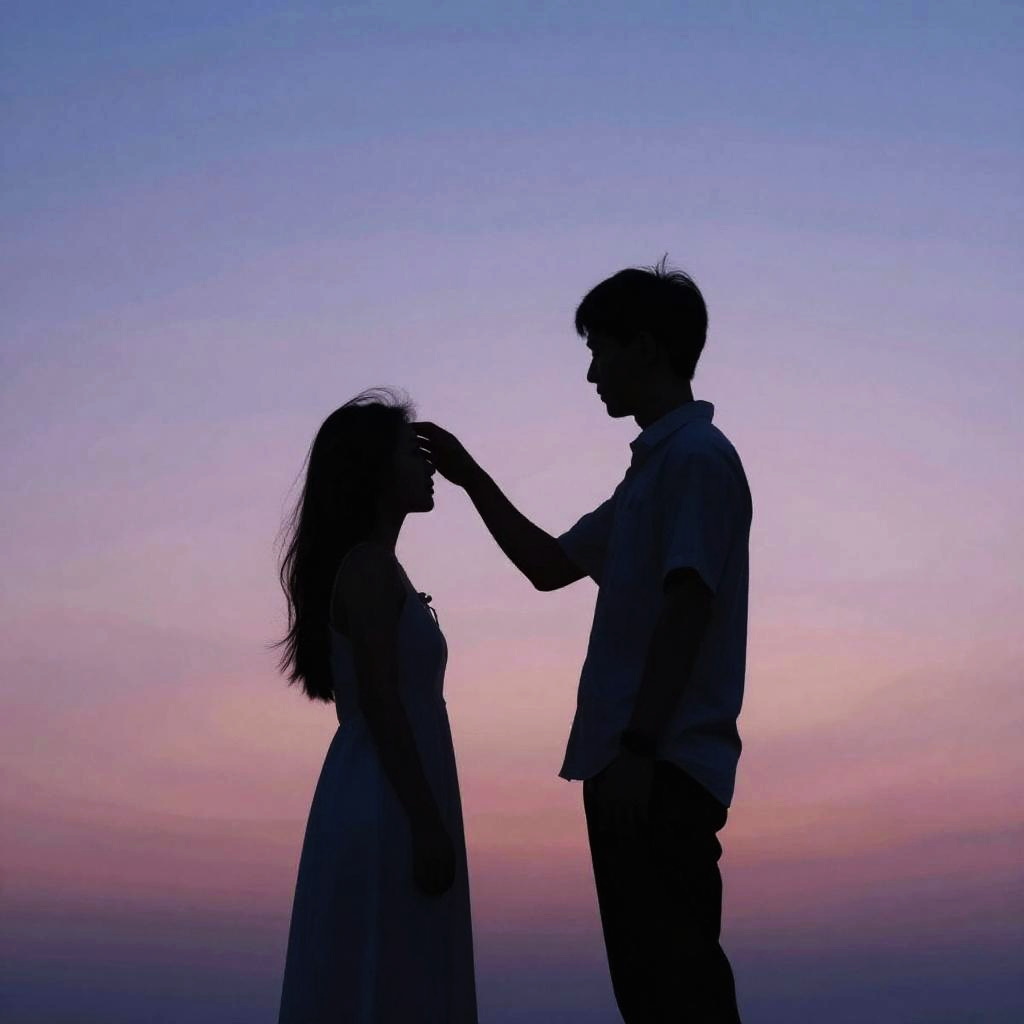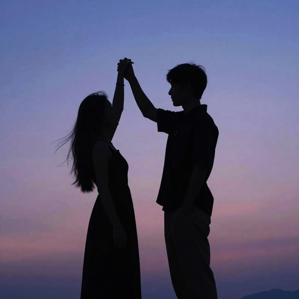 Photograph of a silhouetted couple holding hands against a twilight sky. The girl, with long hair, wears a flowing dress, while the boy, with short hair, wears a casual shirt and pants. The sky transitions from deep blue at the top to pink and purple hues near the horizon. Their profiles are visible, but details are obscured by the dark silhouettes. The background includes a faint outline of distant mountains. The image conveys a romantic, serene atmosphere with a focus on the couple's connection.