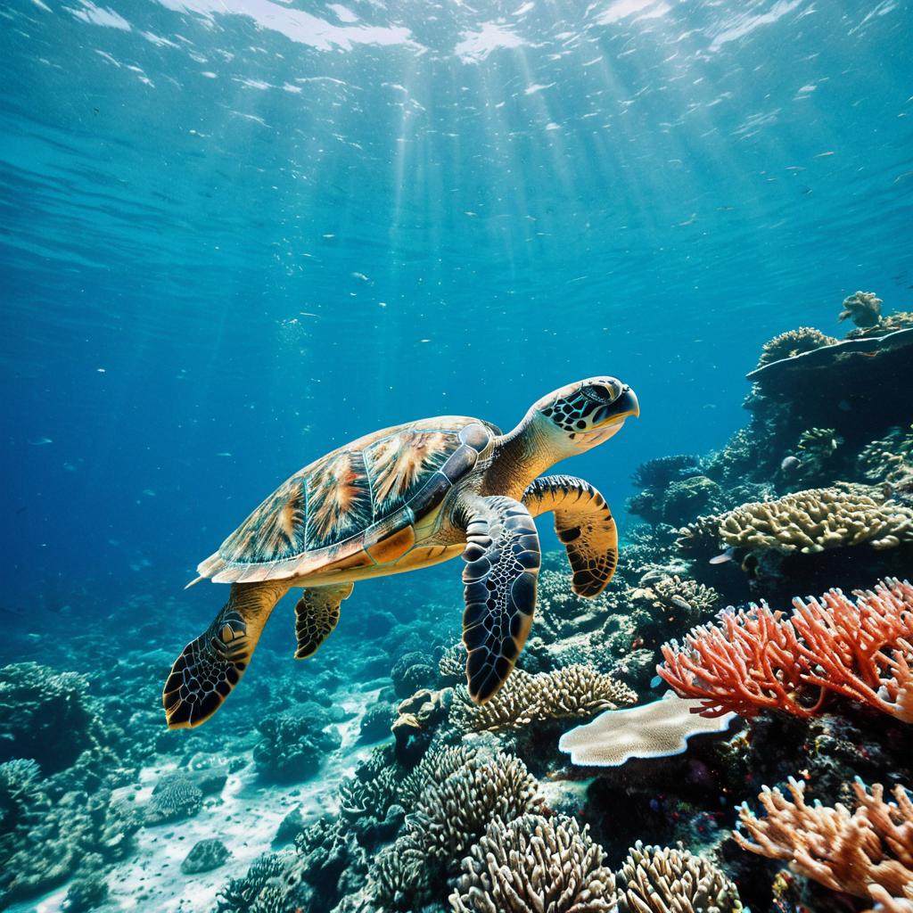 A underwater photo of graceful sea turtle swimming among coral reefs in crystal clear tropical ocean, showcasing vivid, immersive photography.