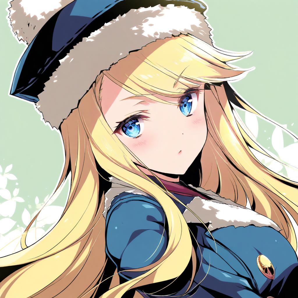 Anime-style illustration of a young girl with long blonde hair and striking blue eyes. She is wearing a blue winter outfit with a fur-trimmed hat and collar. The background is light green with subtle floral elements, highlighting the character.
