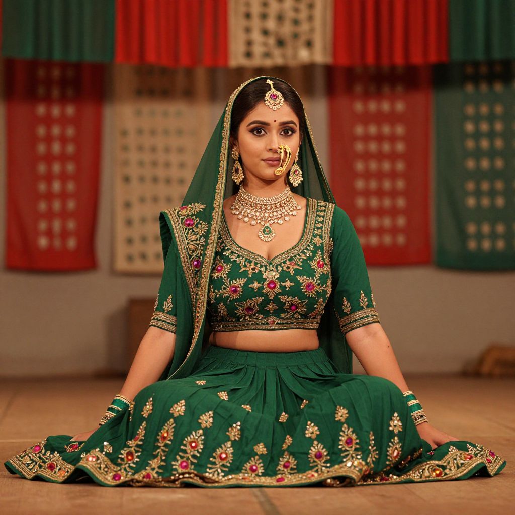 A cinematic-style image of a woman with fair skin, large brown eyes, and a relaxed expression wearing a beautifully embroidered green chaniya choli as a costume for a cultural performance, seated on a wooden stage under a canopy of red and green banners during a traditional folk dance event in India. The woman has big breasts and cute face