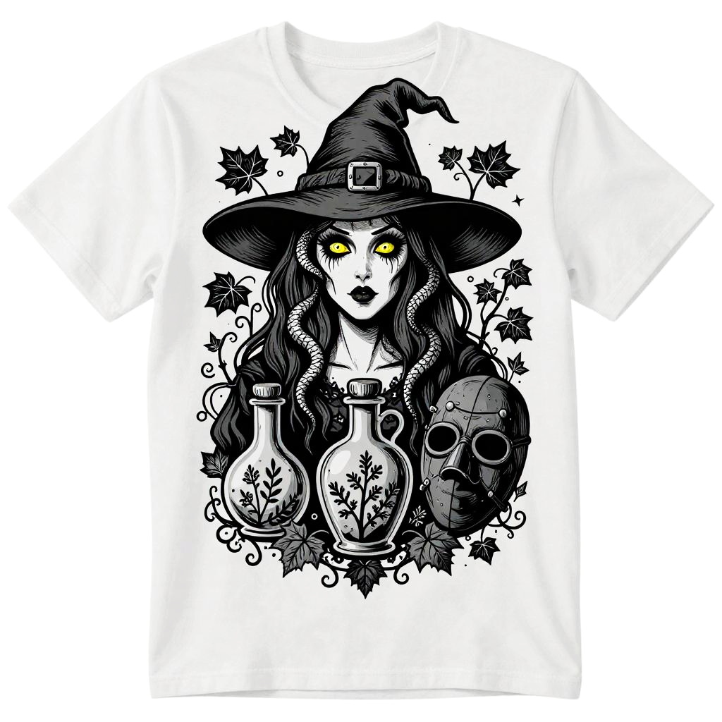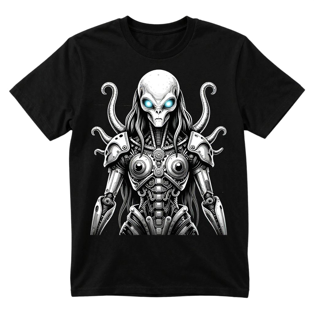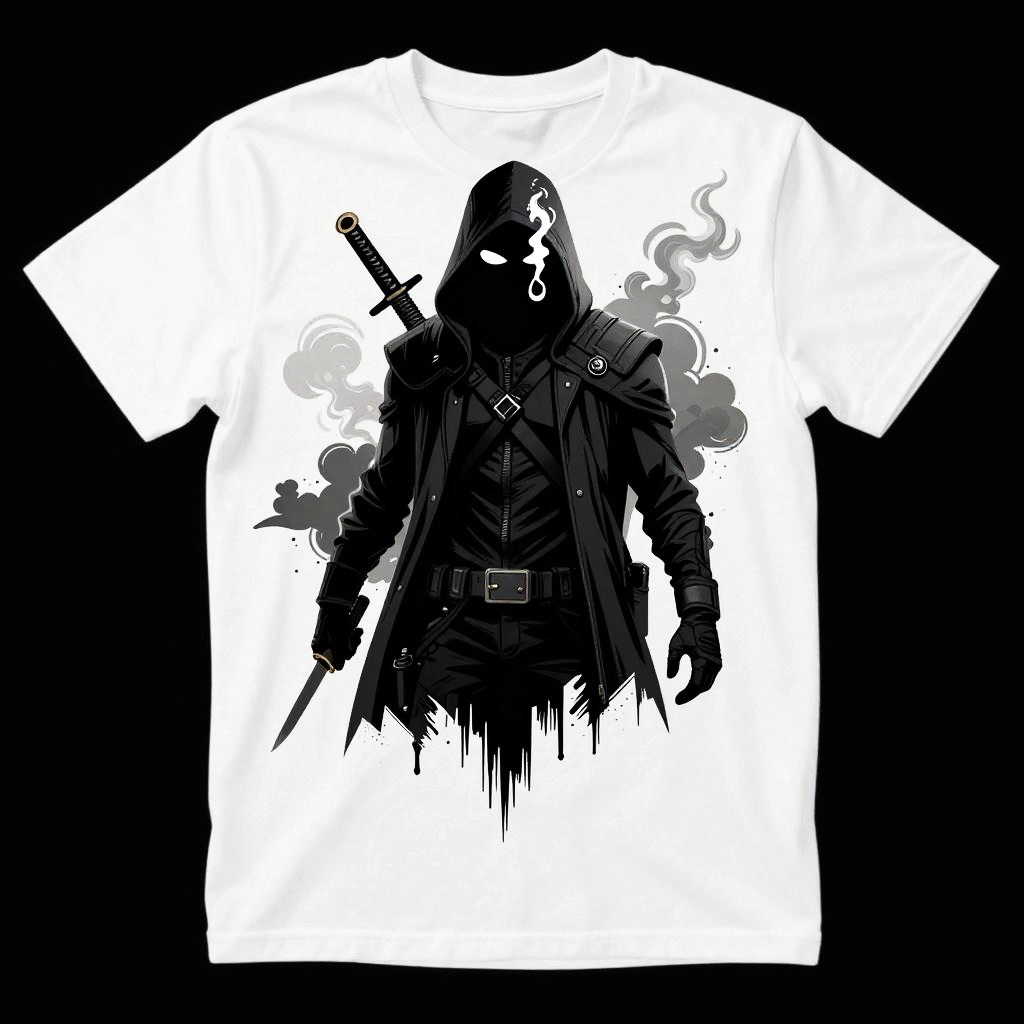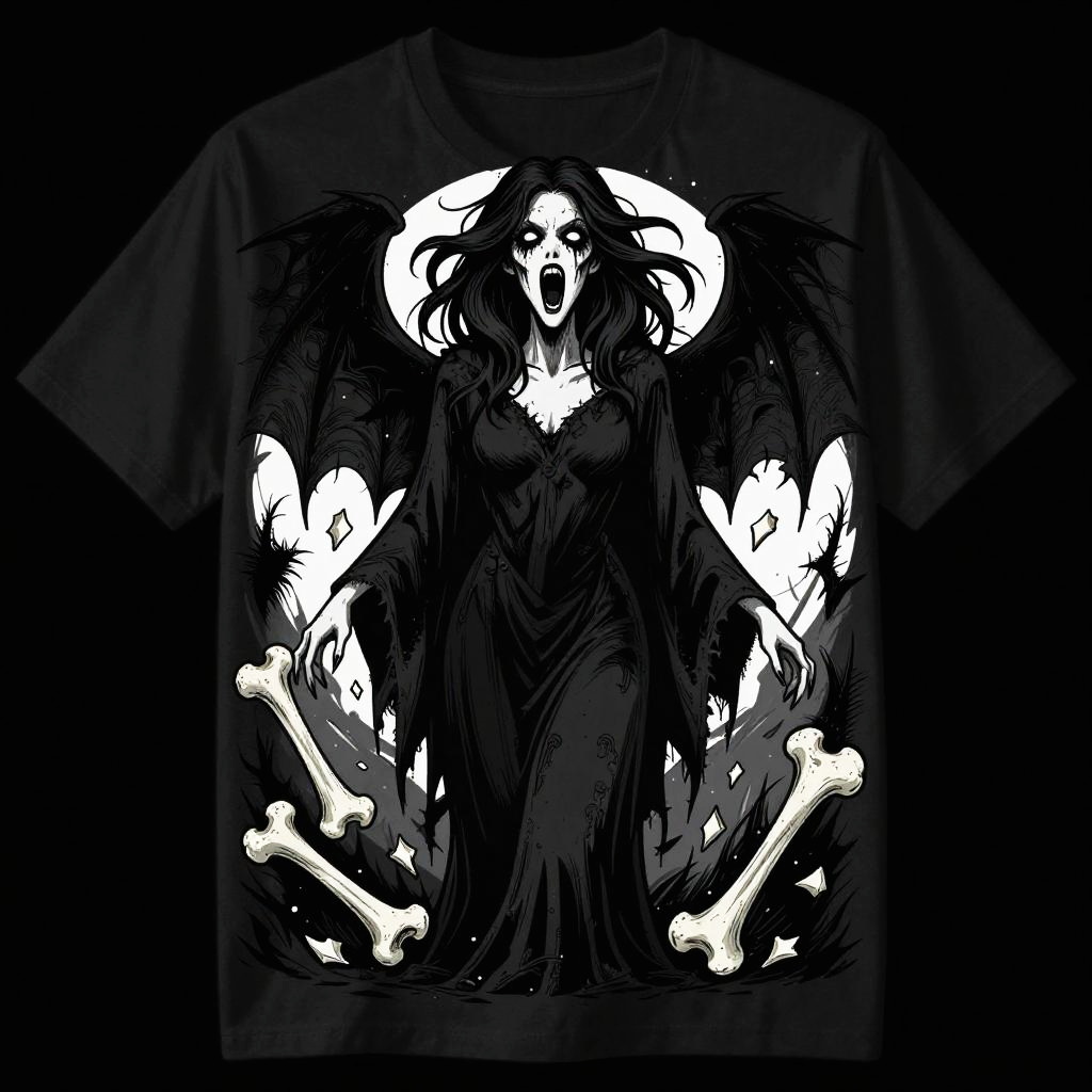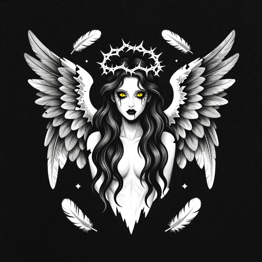 Overhead t-shirt design featuring a harpy with piercing eyes and wild hair. Styled in gothic fantasy, featuring razor feathers, broken chains, and storm clouds with black-and-white vector illustration on a black background.