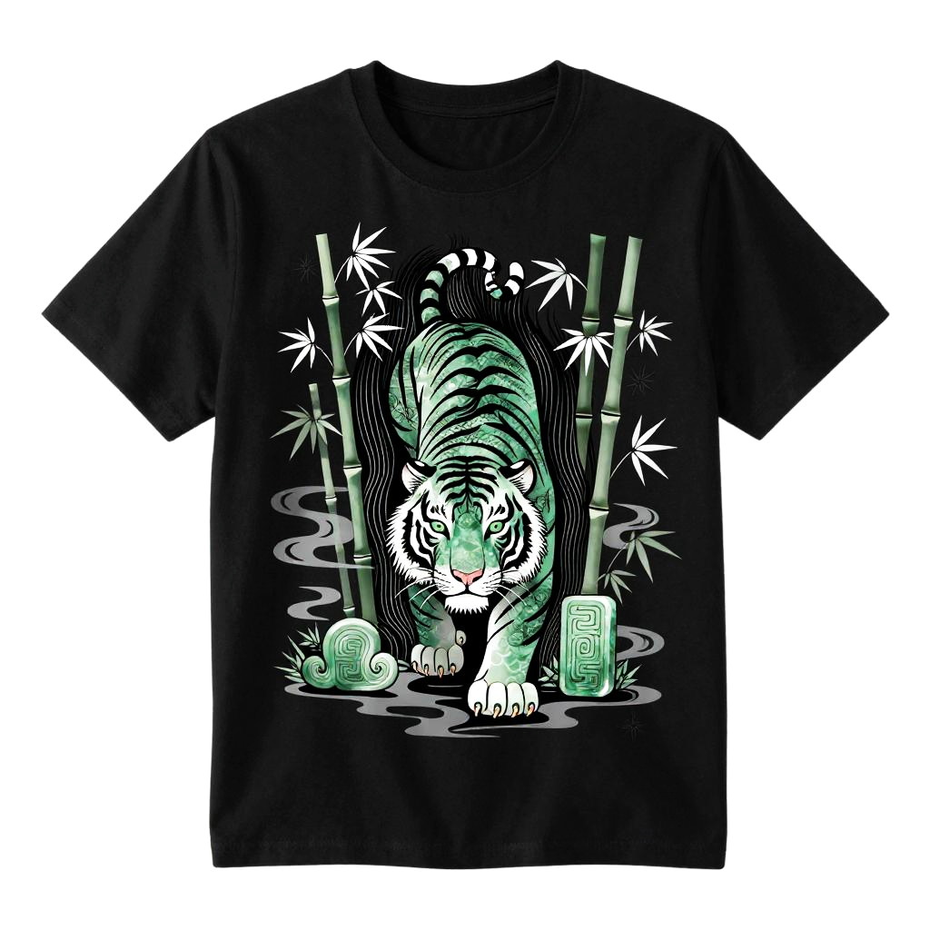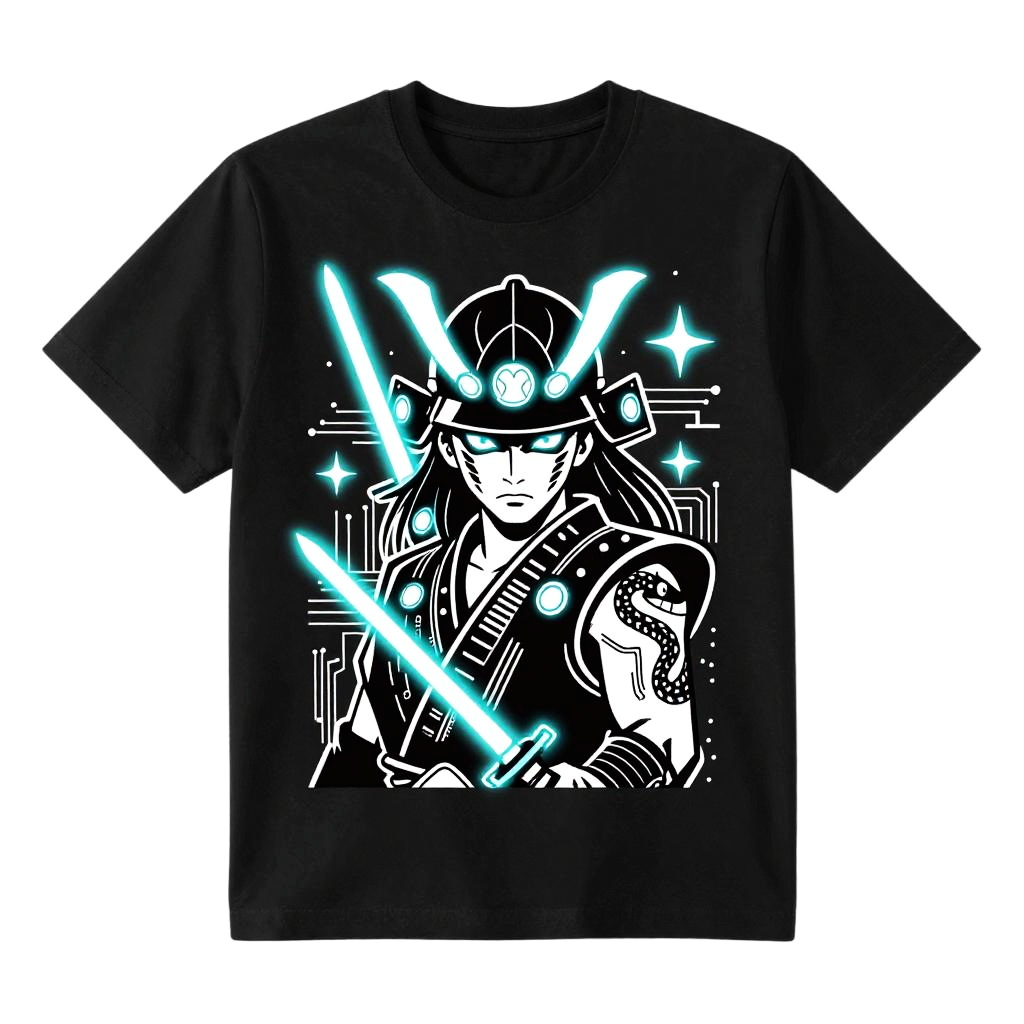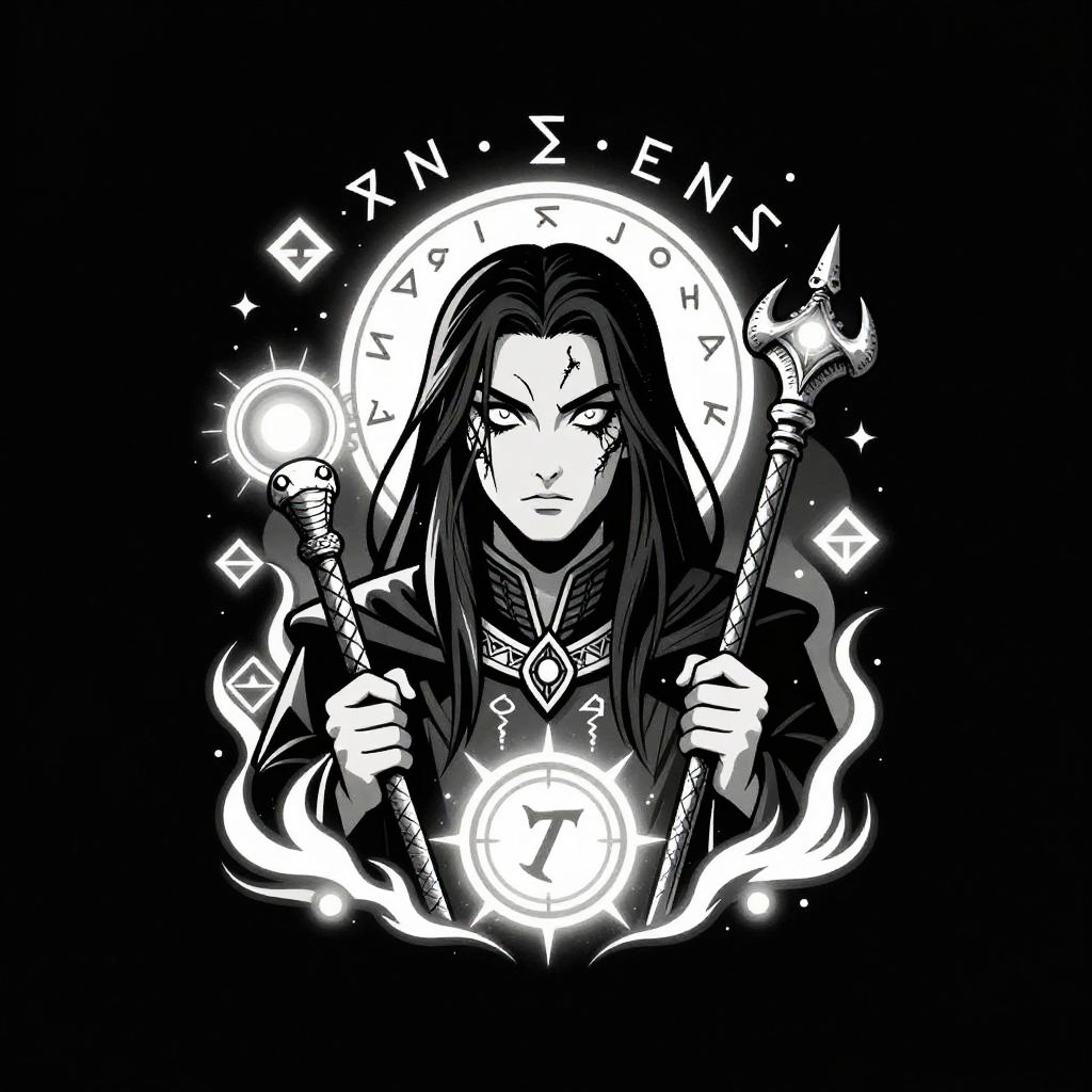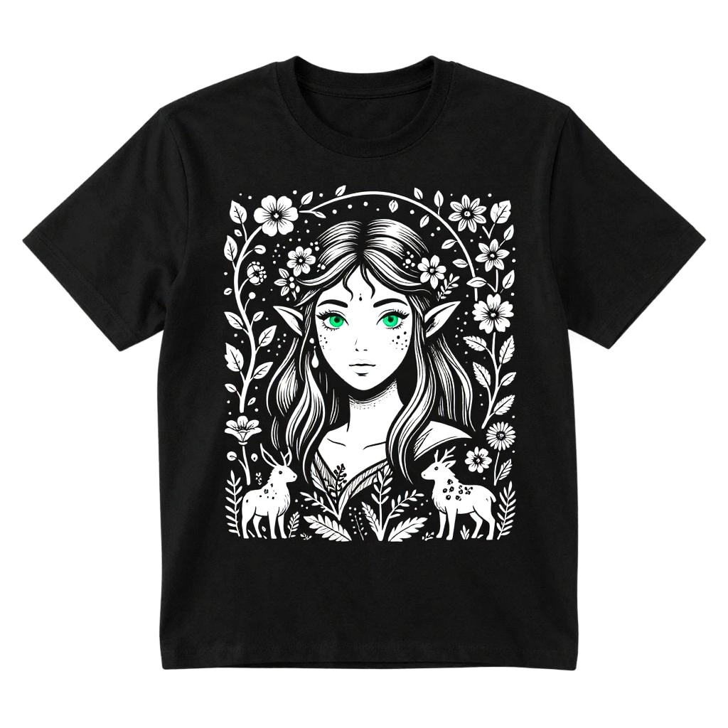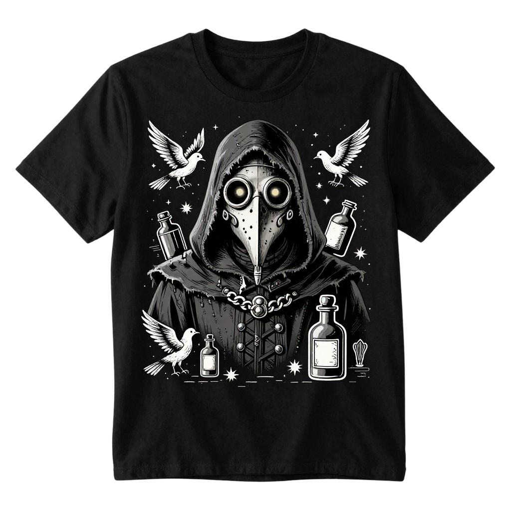 Overhead t-shirt design featuring a harpy with piercing eyes and wild hair. Styled in gothic fantasy, featuring razor feathers, broken chains, and storm clouds with black-and-white vector illustration on a black background.