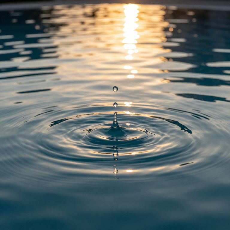 A serene pool reflects the golden hour light, capturing the delicate ripples of a droplet's impact, symbolizing the infinite possibilities of diverging timelines shimmering beneath the surface in this high-definition, contemplative scene.
