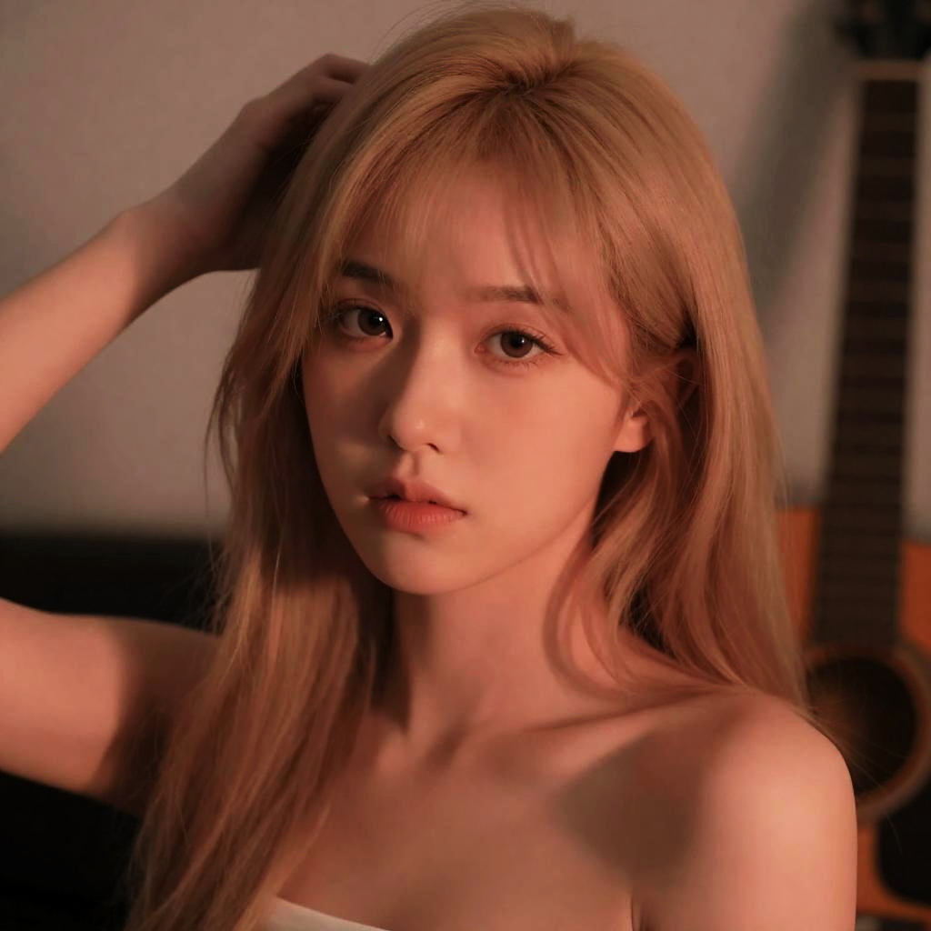 Digital art portrait of a blonde woman with long straight hair and bangs, looking downward with a serene expression. Her face is decorated with orange and red floral patterns on both cheeks. The background is an abstract blend of green and beige tones, enhancing the ethereal, nature-inspired aesthetic.