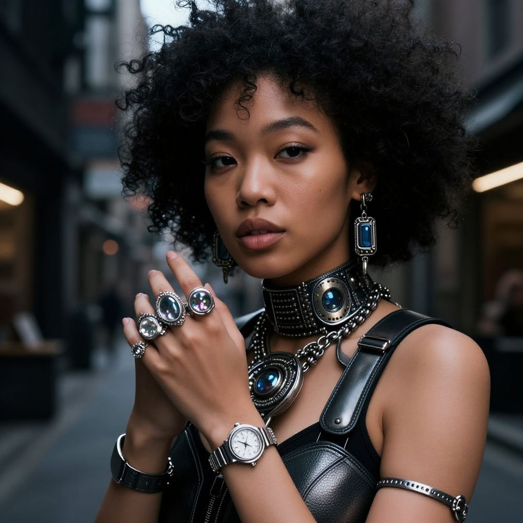 "Superpowers expert jeweler, beautiful Afro-Asian cyborg woman, bedazzled, lots of rings on her fingers, cyber diesel punk black market alley background, 8k, photorealistic, ultra detailed, d&d style,"
