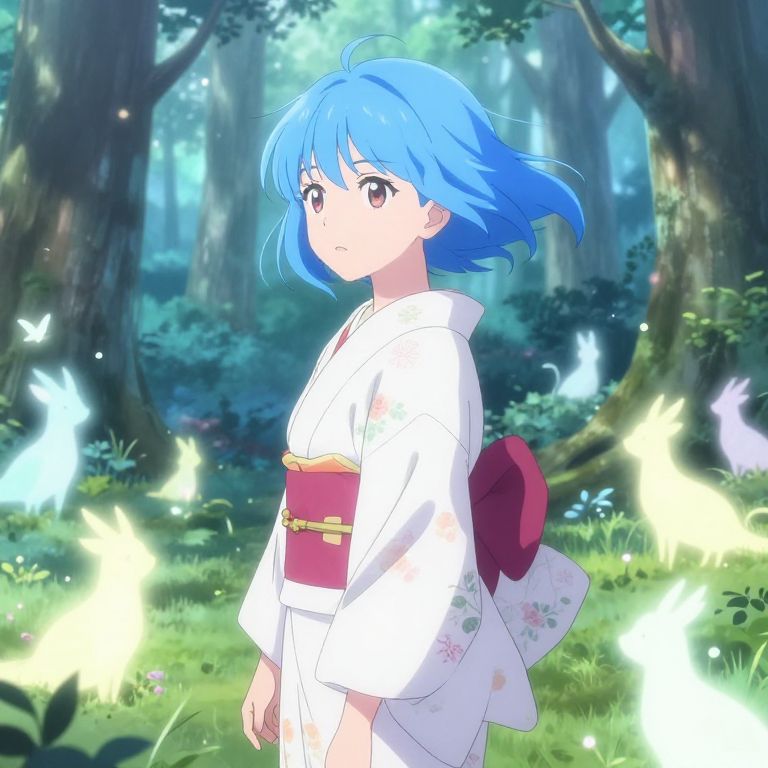 Anime with girl with blue hair in a serene forest clearing surrounded by glowing mystical creatures, soft pastel colors, intricate floral patterns on her kimono, gentle breeze moving her hair, magical and peaceful atmosphere, high detail and anime-style illustration.