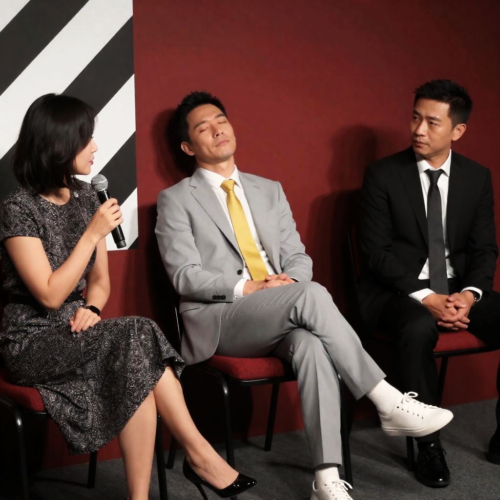 Photograph of three people in a dimly lit room. Center: man in light gray suit, yellow tie, white sneakers, leaning back in red chair, eyes half-closed. Left: woman with short black hair, black and white patterned dress, holding microphone. Right: man in black suit, white shirt, dark tie, sitting, looking at woman. Background: red wall with shadow, black and white geometric pattern.