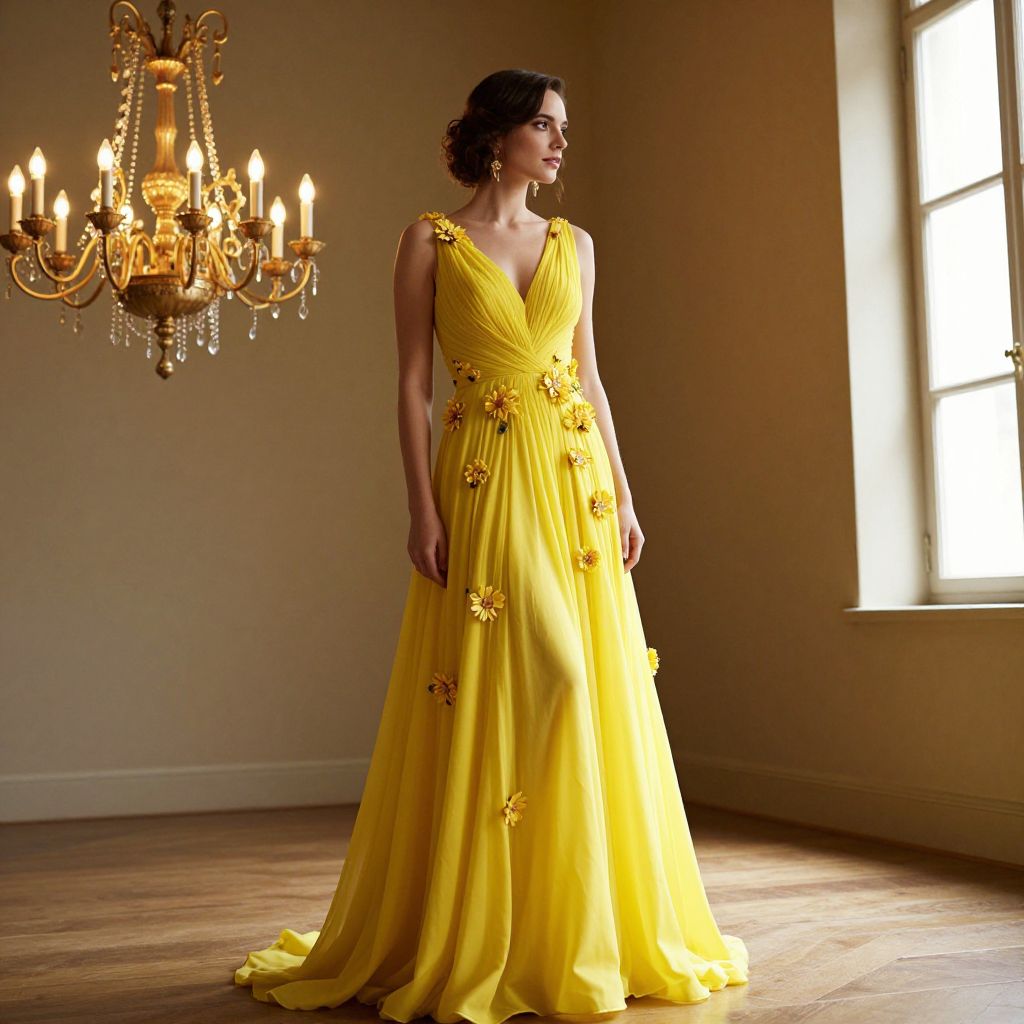 Photograph of a woman standing in an elegantly lit room with warm, yellow-tinted light. She wears a floor-length, bright yellow gown with a deep V-neck and floral embellishments on the bodice and skirt. Her dark hair is styled in an updo. To her left, a grand, ornate chandelier with glowing candles hangs from the ceiling. The background features a large window allowing sunlight to stream in, highlighting the wooden floor and beige walls. The woman's posture is confident, with a slight profile view.