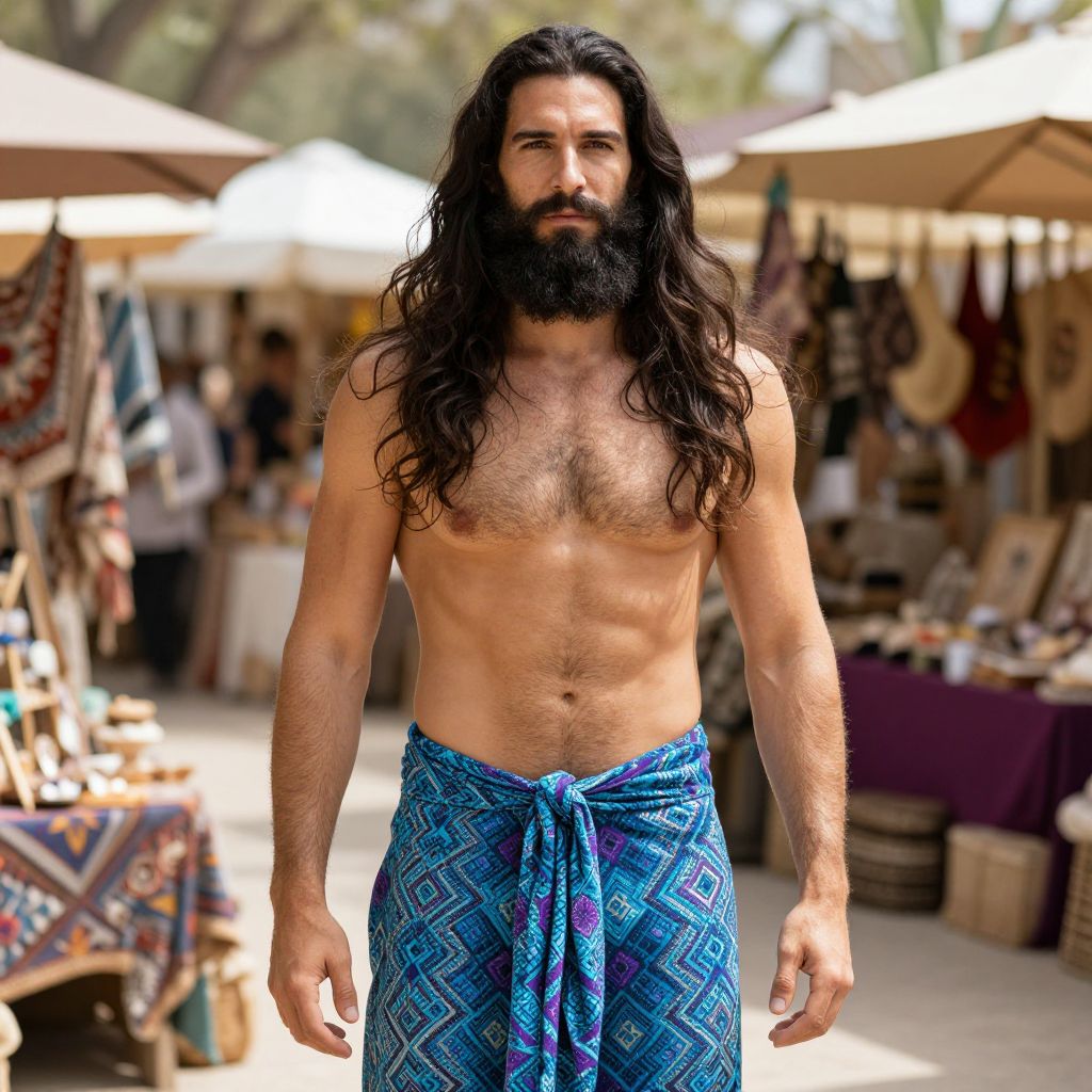 A ruggedly handsome man with long, flowing dark hair and a thick, well-groomed beard, wearing a pair of vibrant fishtail pants featuring a striking blue and purple geometric pattern, standing in a sun-drenched, bohemian market.