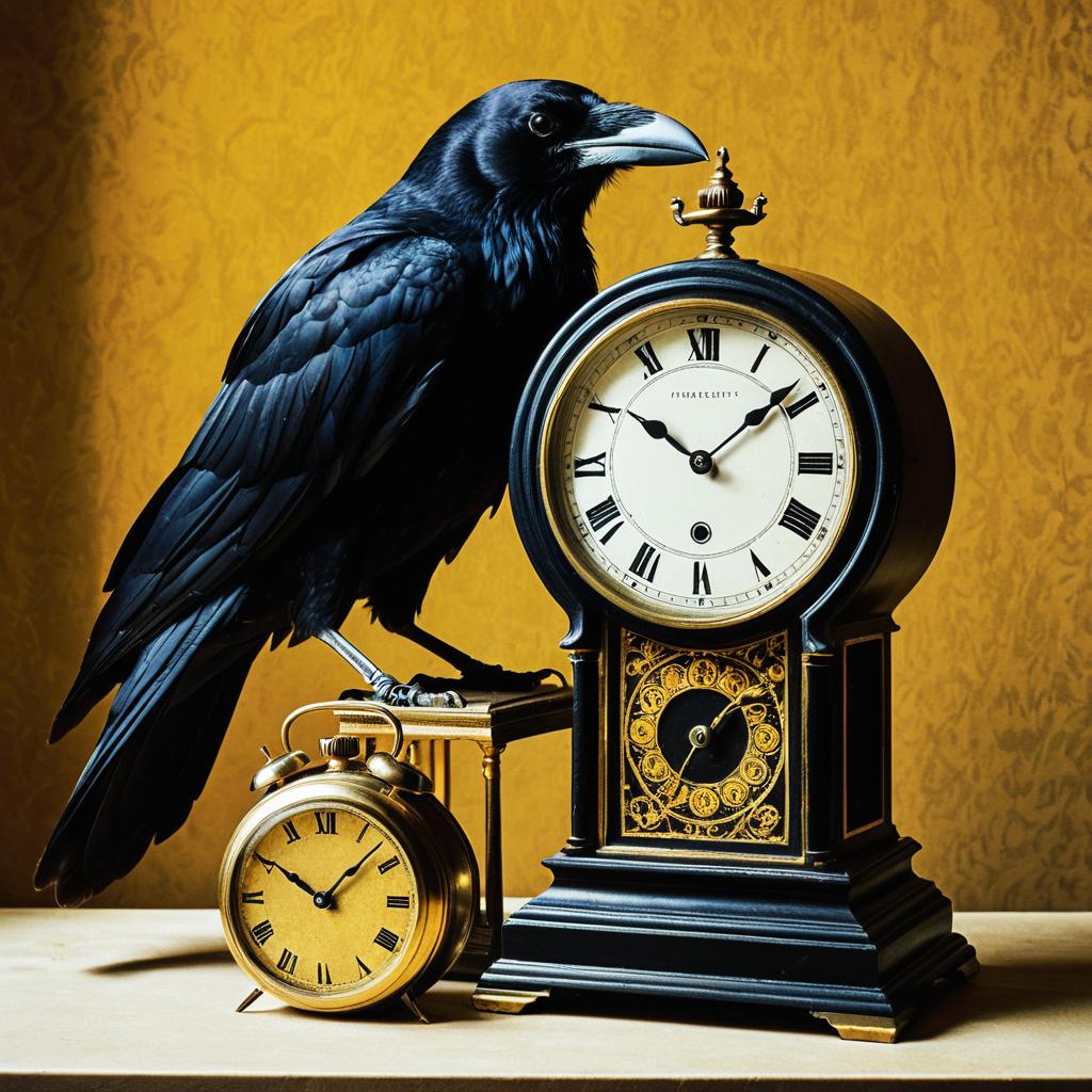A surreal still-life composition of a antique clock and mysterious raven, created in Gustave Klimt and René Magritte, with rich gold tones, surreal contrasts, impressionistic and vivid, sunny mood